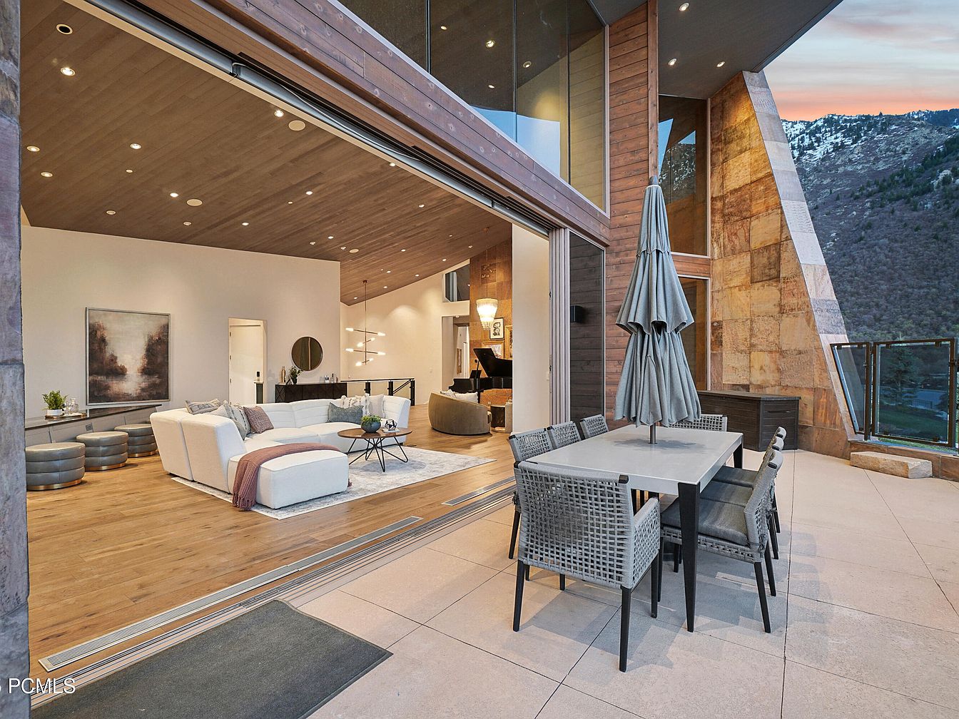 This seamless transition from a spacious living room to a generous outdoor patio exemplifies modern indoor-outdoor living. The living area boasts a high wooden ceiling with recessed lighting, light wood flooring, and a neutral color palette centered around soft whites and natural tones. A large, comfortable sectional sofa anchors the space alongside minimalist coffee tables and subtle decorative accents. Floor-to-ceiling glass panels, fully opened here, enhance the flow to the patio, which features a shaded dining setup with woven chairs and a rectangular table. The backdrop includes a dramatic stone wall and scenic views of rugged mountainous terrain at sunset, adding warmth and connection to nature.