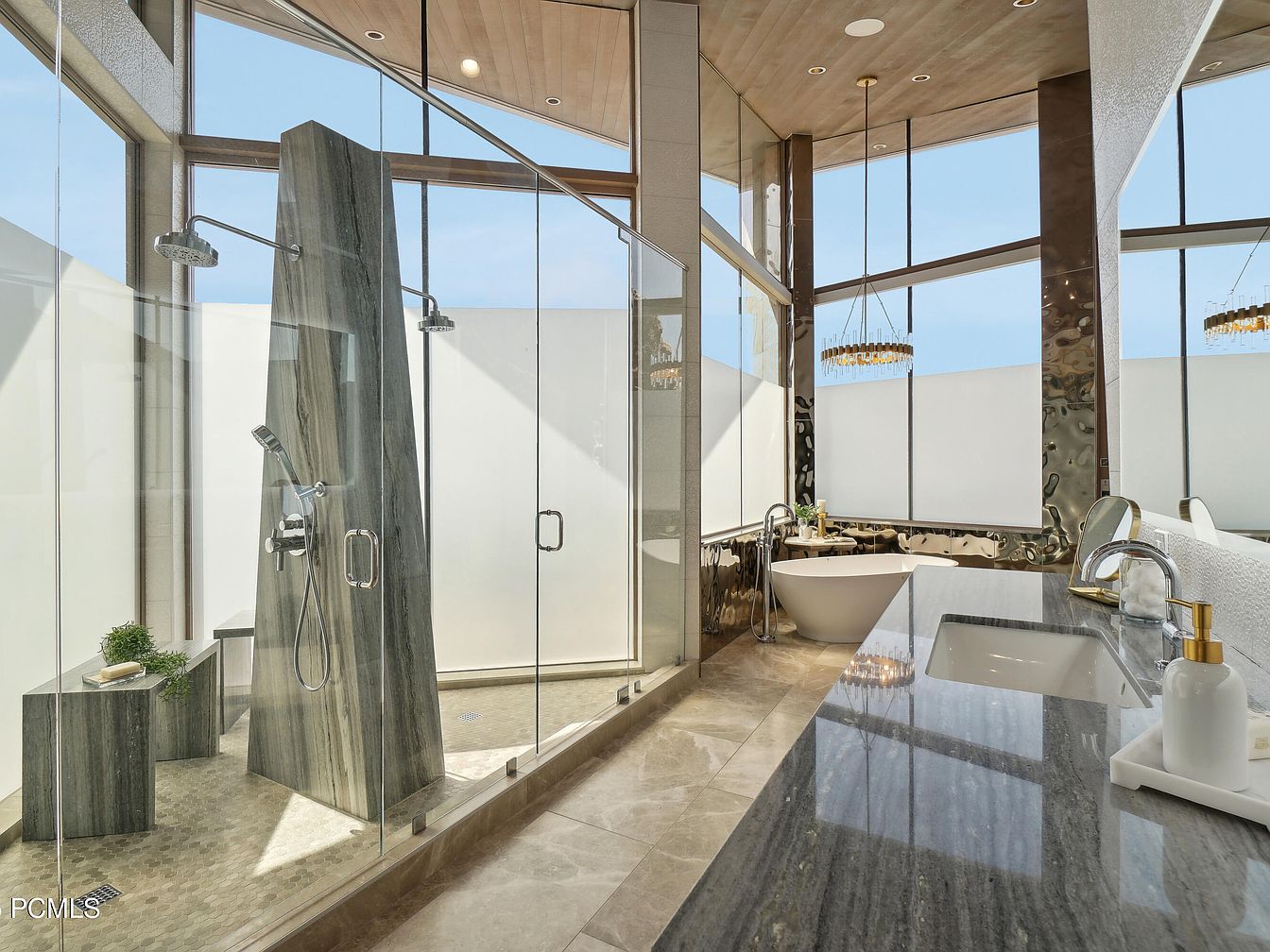 This spacious bathroom features a sleek, modern design with a prominent walk-in glass shower enclosed by clear panels, showcasing a striking vertical stone slab with dual rainfall showerheads. Neutral tones dominate the space with beige marble floors and a dark polished stone countertop offering a smooth contrast. A freestanding white tub rests beside large windows outfitted with frosted lower panes for privacy, while upper clear panes allow abundant natural light. Reflective wall panels and a chic chandelier add glamour, complementing the minimalist fixtures and conveying an inviting, luxurious atmosphere. Functional yet elegant, the layout optimizes openness and comfort.