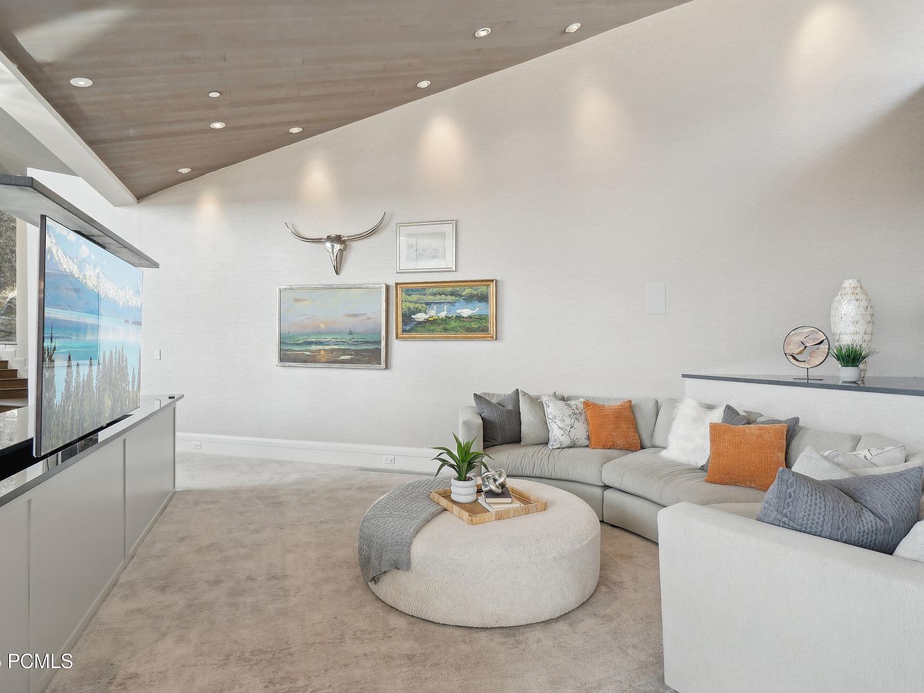 This cozy living room features a plush, light beige sectional sofa adorned with a mix of textured cushions in soft grays, warm orange, and creamy white, creating a welcoming contrast. A large round ottoman sits in the center, topped with a wooden tray holding a small plant and decorative objects. The space is carpeted with a neutral-toned carpet that complements the overall muted palette. Walls are painted a light, soft gray and display tasteful artwork, including serene landscape paintings and a metallic bull skull for a subtle rustic touch. The ceiling is wood-paneled with recessed lighting, adding warmth and depth to the airy, modern design. A sleek, large flat-screen TV is positioned opposite the seating area, creating a perfect balance between comfort and entertainment.