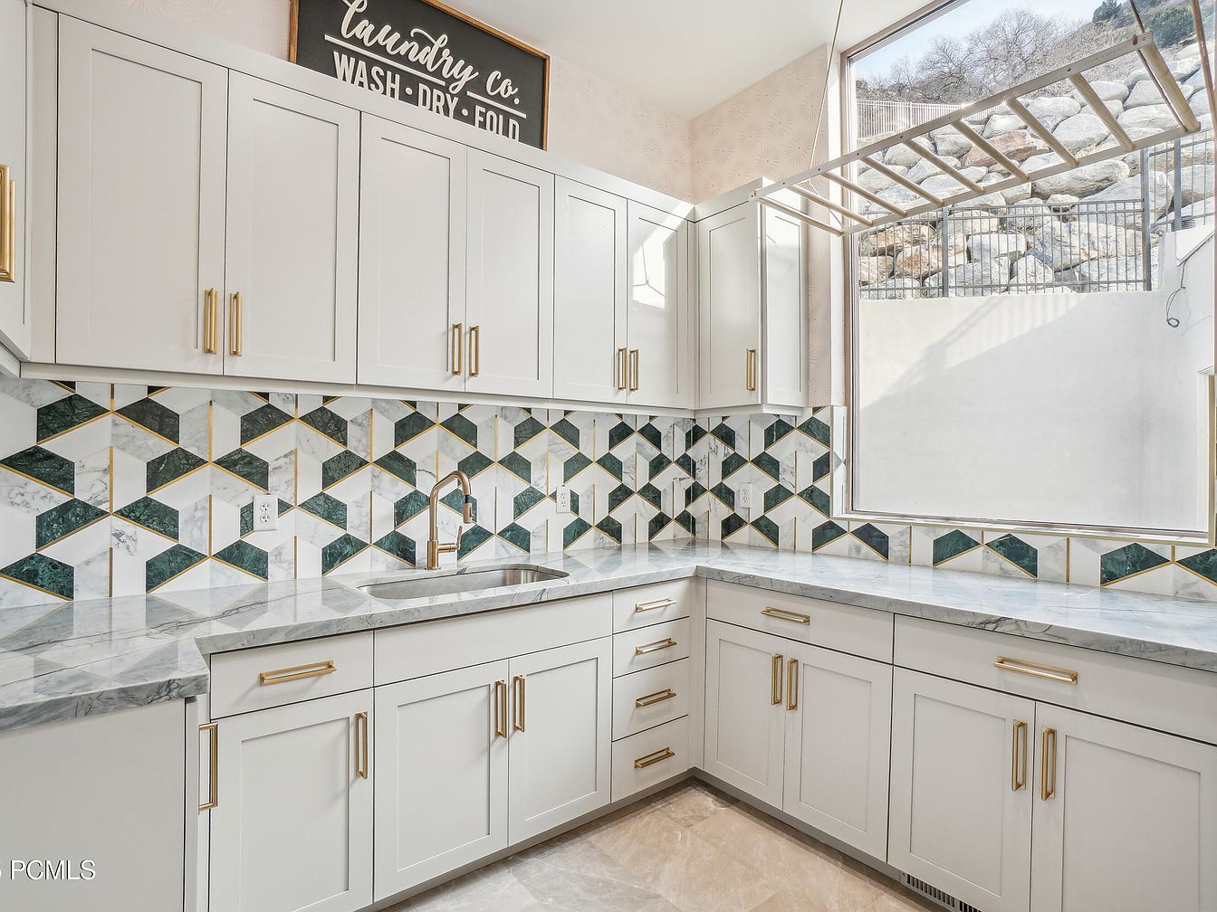This laundry room features a bright and airy corner layout with white shaker-style cabinetry adorned with sleek, modern gold handles. The countertops display a polished marble surface, enhancing the room’s clean sophistication. A geometric patterned backsplash with green, white, and gold accents adds a striking visual element and contemporary flair. Above the workspace, a large window with an outdoor view floods the space with natural light, complementing the neutral beige floor tiles. A practical drying rack is installed near the window, combining functionality with design elegance in this thoughtfully planned utility space.