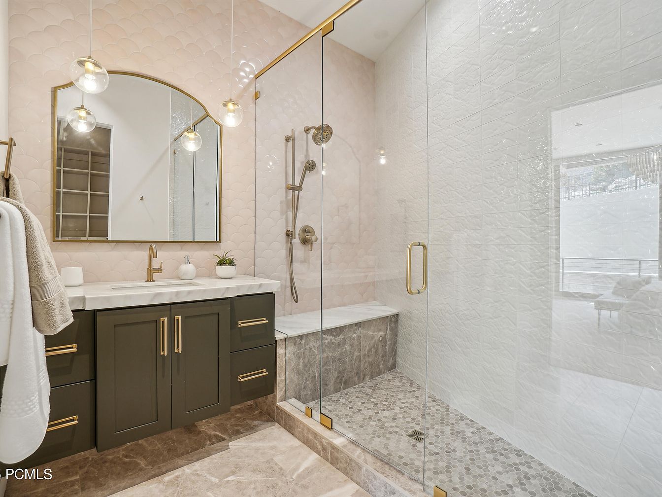 This bathroom features a sleek and modern vanity with dark olive cabinets and gold-toned hardware, complemented by a white marble countertop. Above the vanity is a large arched mirror framed in gold, flanked by two globe pendant lights with brass accents that add a warm glow. The walls behind the vanity have soft pink fish scale tiles creating a subtle texture, while the adjacent walk-in shower is enclosed with clear glass panels and gold fixtures. The shower bench is clad in gray marble, matching the floor’s earthy-toned tiles, and the shower floor is detailed with small hexagonal tiles, enhancing the overall sophisticated and contemporary feel of the space.