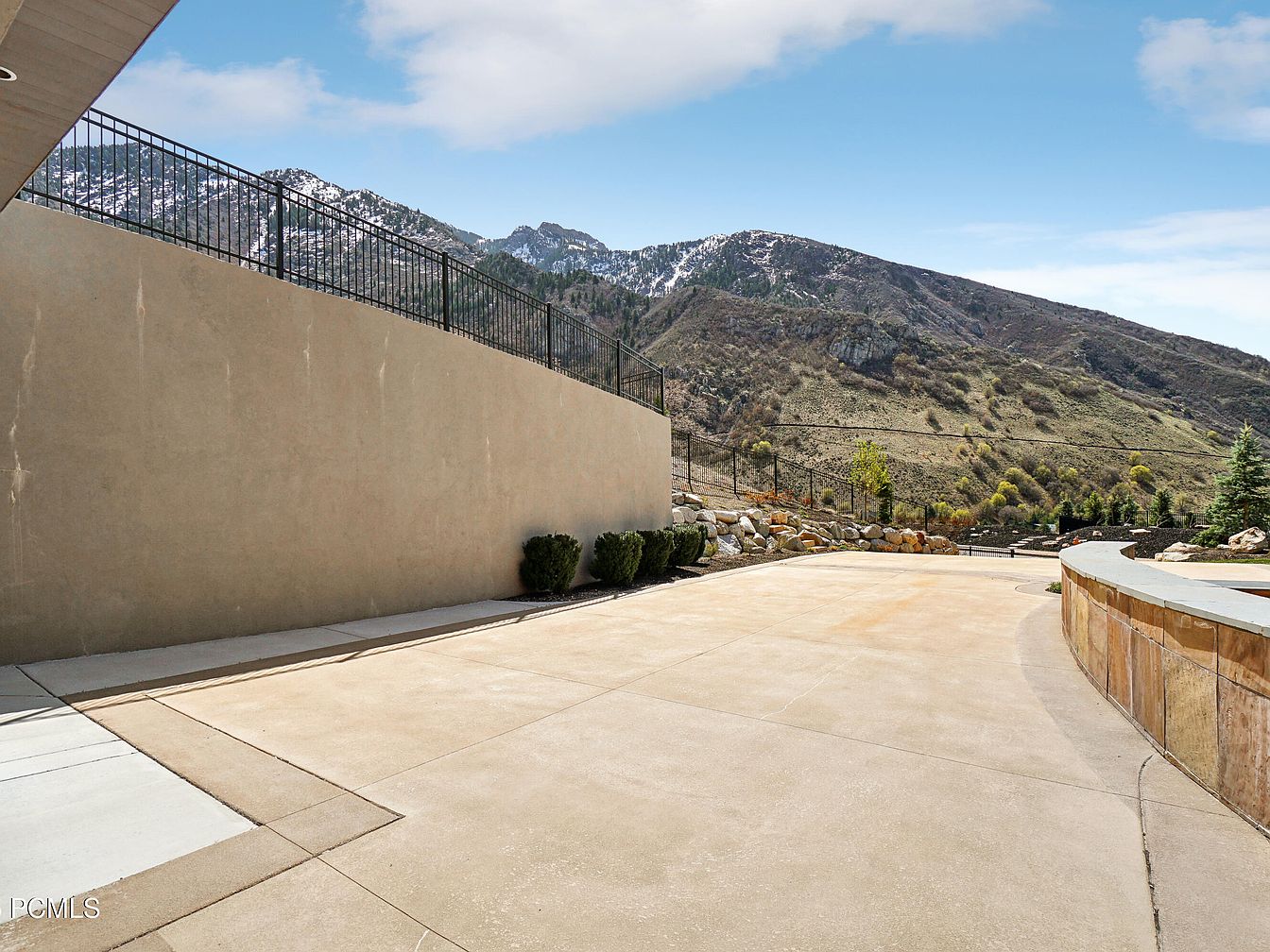 This spacious outdoor patio features a smooth, expansive concrete surface bordered by a low stone wall on one side and a tall stucco retaining wall with a black metal railing above on the other. The area is open and uncluttered, allowing for multiple uses such as seating or recreational activities. A small row of neatly trimmed bushes lines the base of the stucco wall, adding a touch of greenery. The patio overlooks a stunning mountainous landscape, with rocky terrain and patches of snow visible in the distance, enhancing the serene, natural ambiance.