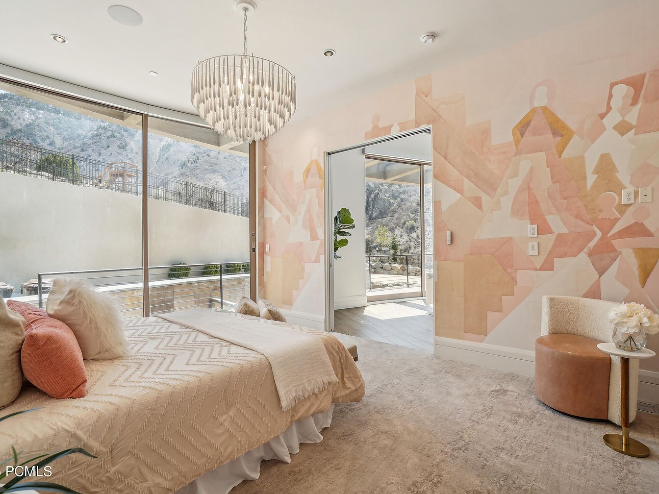 This serene bedroom features a large floor-to-ceiling sliding glass door that ushers in natural light and offers sweeping views of the rugged mountain landscape outside. The room is anchored by a plush bed dressed in soft beige and cream textured bedding, accented with coral and neutral throw pillows for a cozy touch. The accent wall shares a subtle geometric mural in muted warm tones of peach, blush, and soft amber, adding depth without overwhelming the space. A modern, circular chandelier with delicate hanging elements adds elegance overhead. A rounded, leather-accented chair pairs with a minimalist side table, completing this tranquil retreat with understated sophistication.
