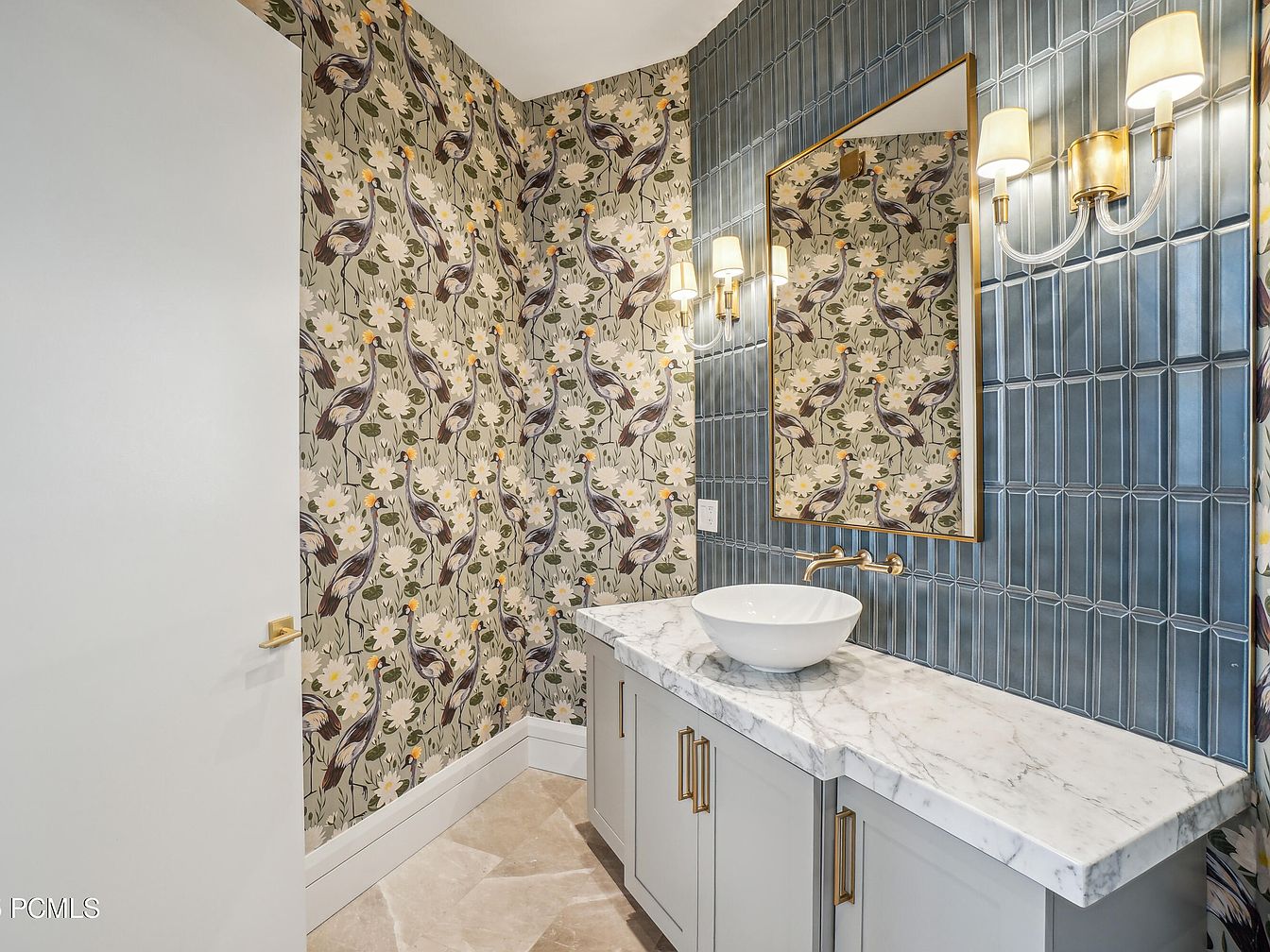 This powder room features a striking blend of patterns and textures with a focus on the vanity area. The walls are adorned with a lively wallpaper depicting cranes and white flowers set against a neutral beige background, adding an artistic and nature-inspired touch. The wall behind the vanity contrasts beautifully with vertical, glossy blue-gray tiles that bring a modern geometric dimension. A large, gold-framed mirror enhances the space’s depth and reflects the wallpaper’s design. The white countertop, crafted from marble with subtle gray veins, supports a sleek vessel sink and a wall-mounted brass faucet. Soft lighting comes from two double-arm sconces with white shades, complementing the brass fixtures and cabinetry hardware. The floor features warm stone tiles in a beige hue, grounding the vibrant and elegant aesthetic of this intimate space.