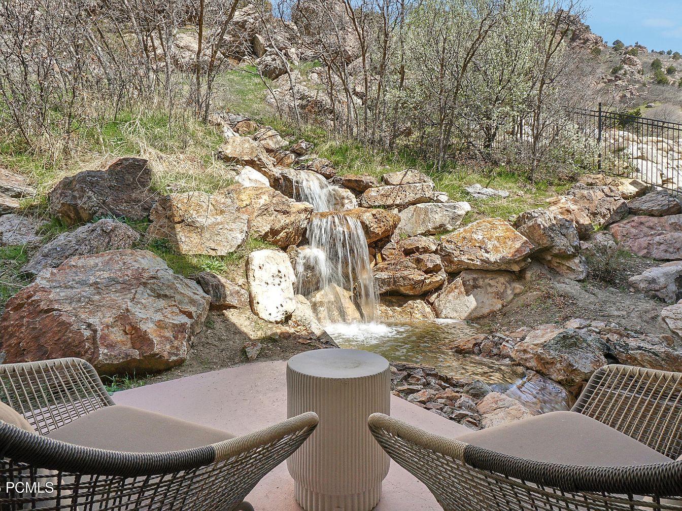 This serene outdoor space showcases a small cascading waterfall flowing over natural rocks, creating a tranquil water feature. The seating area on a smooth, curved concrete pad faces the waterfall, featuring two modern woven chairs and a textured cylindrical side table in neutral tones. The surrounding landscape is natural and rugged, with rocks, sparse grass, and budding trees nestled against a hillside. The design emphasizes a seamless blend with nature, offering a peaceful retreat with soothing water sounds and an inviting spot for relaxation amidst the earthy color palette of browns, greens, and stone hues.