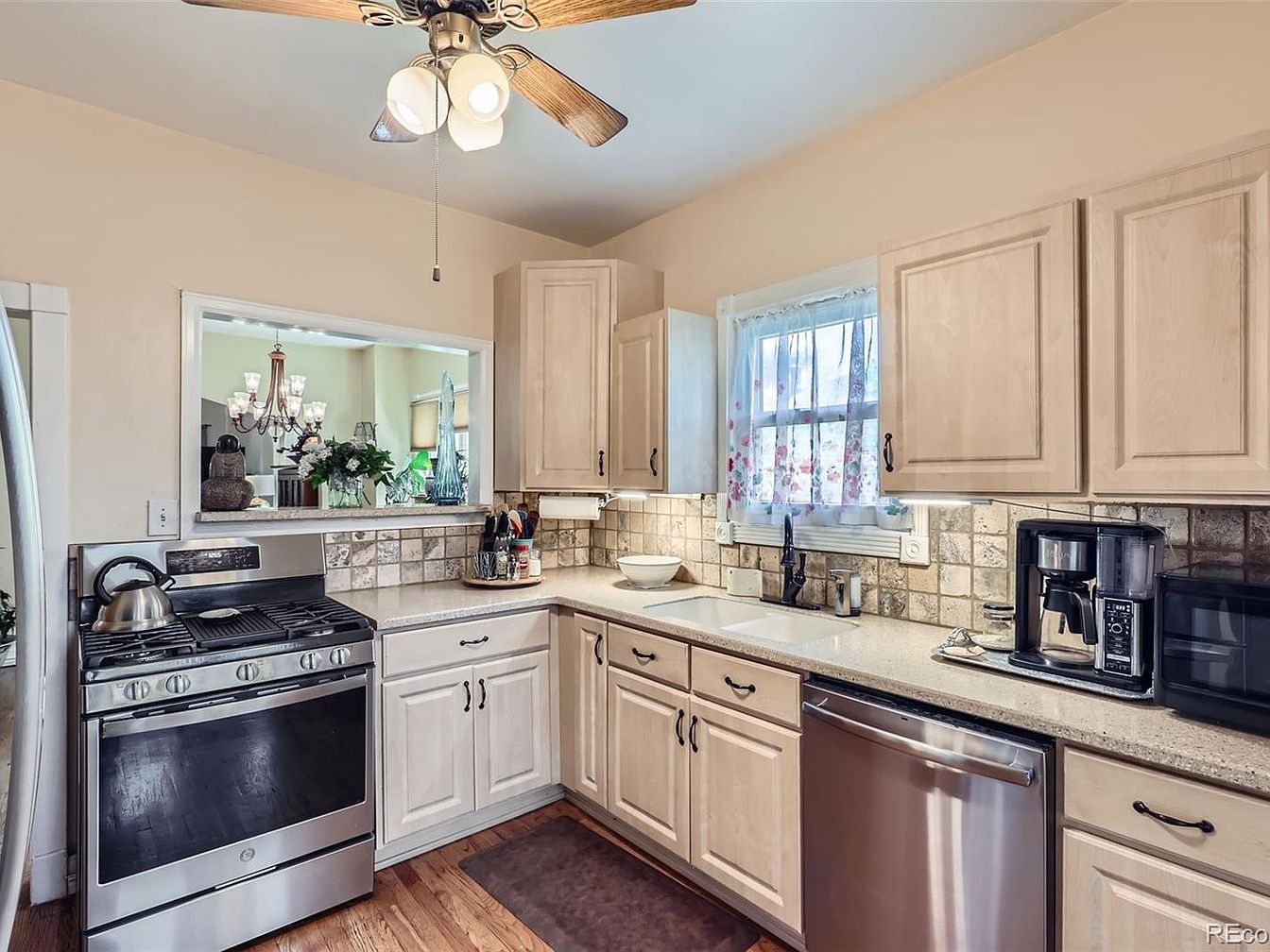 This kitchen features a warm, inviting design with light wood cabinetry accented by black hardware, creating a soft contrast against the beige walls and tiled backsplash. The countertops are a light, speckled material that complements the natural tones throughout the space. Stainless steel appliances, including a stove, dishwasher, and coffee maker, add a modern touch. A small window above the sink brings in natural light filtered through a sheer curtain adorned with a floral pattern. Wood flooring adds warmth, while a ceiling fan with lights enhances comfort and illumination. An open pass-through connects the kitchen to an adjacent room, enhancing openness.