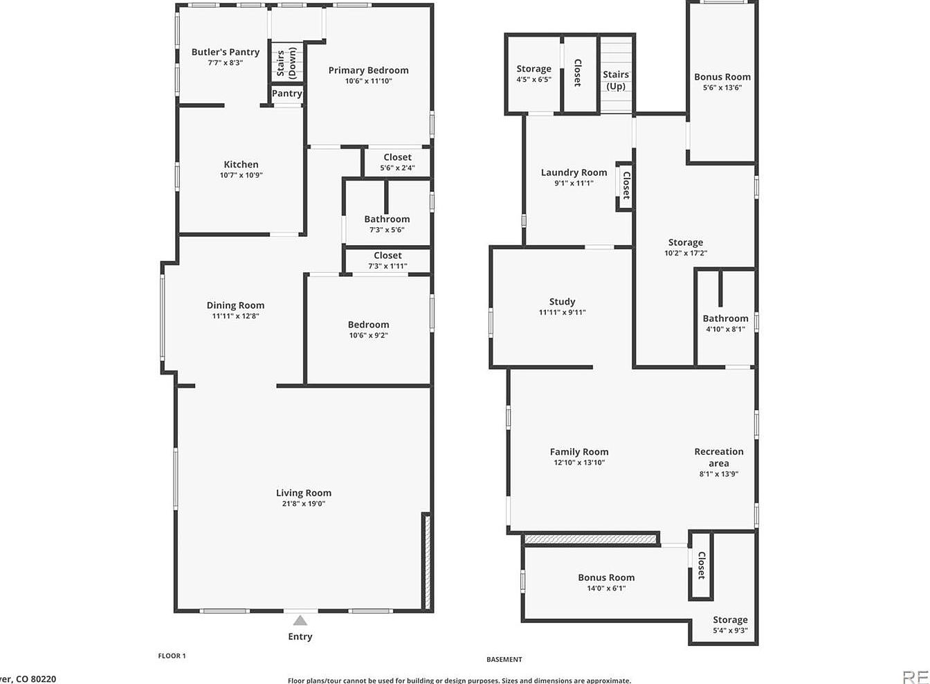 This detailed floor plan outlines a well-organized two-level home featuring functional divisions between living, dining, and sleeping areas on the first floor. The entry opens into a spacious living room, adjacent to a large dining room and kitchen, which includes a butler’s pantry for additional storage. Two bedrooms and a primary bedroom with multiple closets and a bathroom cluster together for convenience. The basement highlights versatile spaces such as a family room, recreation area, study, bonus rooms, laundry room, multiple storage areas, and an additional bathroom, supporting diverse lifestyle needs. The layout balances communal and private areas effectively.
