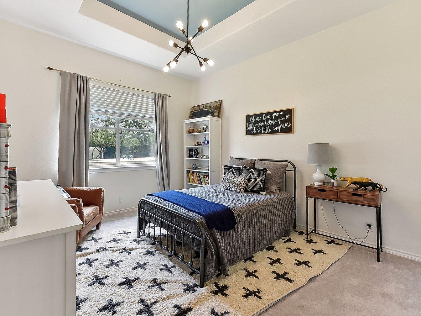 This bedroom features a metal-framed bed dressed in layered bedding with muted gray tones accented by a bold navy throw and patterned pillows. A large cream-colored rug with black X patterns grounds the space, adding texture and warmth. The walls are painted soft white, giving the room a bright, airy feel, complemented by a large window with neutral drapes. A minimalist ceiling light fixture with artistic bulbs adds a modern touch. Furnishings include a small wooden console table with decorative figurines and a white bookshelf filled with books and decor, making the room inviting and personalized.