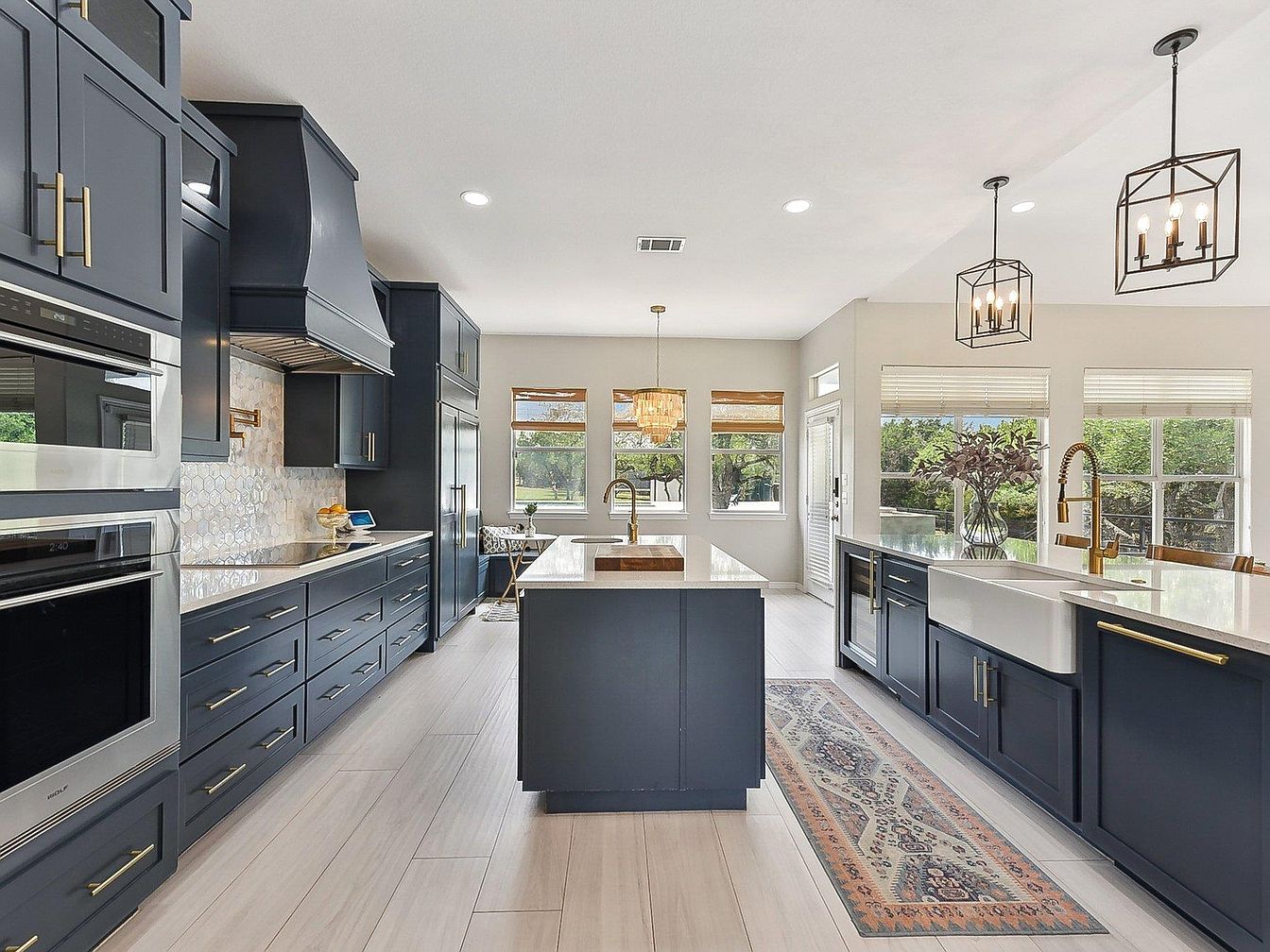 This kitchen features a spacious and open design with a large central island topped in white marble that contrasts beautifully with deep navy cabinetry throughout. The cabinetry includes sleek brass handles lending a touch of warmth and elegance. Light wood-look tile flooring extends throughout, enhancing the bright and airy feel. Multiple windows along one wall flood the space with natural light, highlighting the white countertops and the mosaic tile backsplash behind the stove. Modern pendant light fixtures with black geometric frames hang expertly over the island. Adjacent to the sink, a vintage-style runner rug adds texture and subtle pattern to complement the overall sophisticated aesthetic.