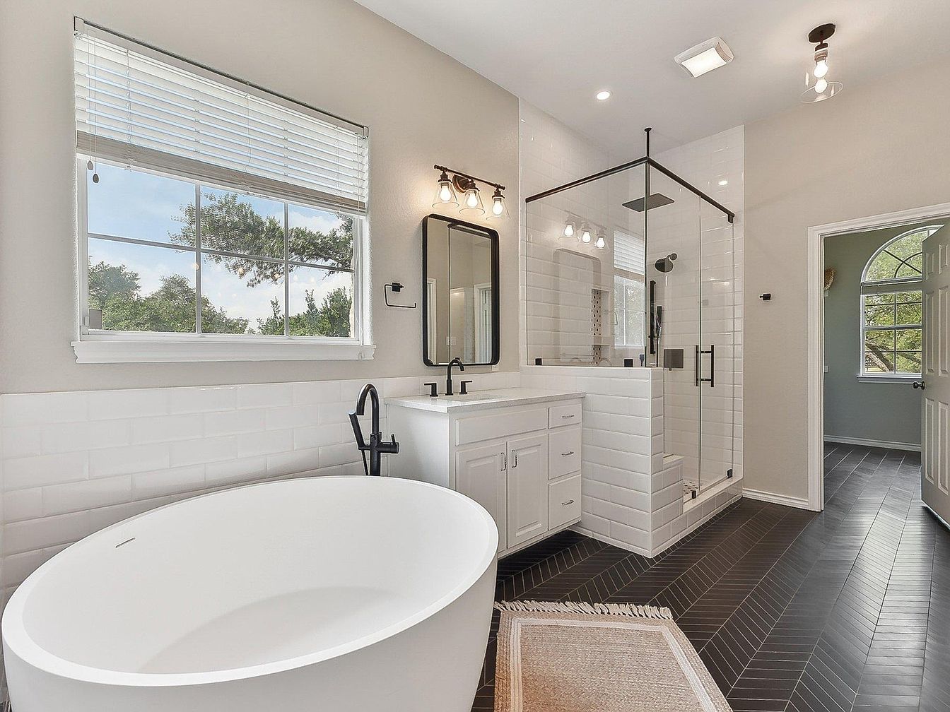 This spacious master bathroom features a clean, modern design with neutral tones and sleek finishes. A large, freestanding white bathtub sits near a wide window, flooding the room with natural light and offering a tranquil view of greenery outside. The vanity includes white cabinetry paired with a black-framed mirror and matte black faucet fixtures, adding sophistication. Adjacent is a glass-enclosed walk-in shower with white subway tile walls and contemporary black hardware. The floor is finished with dark herringbone-patterned tiles, providing striking contrast and texture, while a soft beige rug adds warmth and comfort.