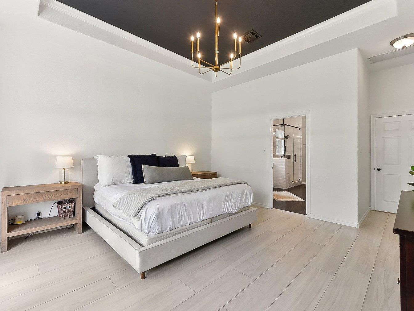 This spacious master bedroom features a serene and modern aesthetic with a neutral color scheme emphasizing white walls and light wood flooring. The bed, upholstered in a soft beige fabric, is the room’s centerpiece and is beautifully adorned with contrasting dark and light pillows and white bedding. On either side, simple wooden nightstands hold minimalist lamps, adding warmth and balance. The ceiling’s dark paint with elegant chandelier lighting introduces a sophisticated contrast. A doorway leads to an en-suite bathroom with clear glass shower doors, enhancing convenience and flow. Clean lines and uncluttered design highlight contemporary comfort.