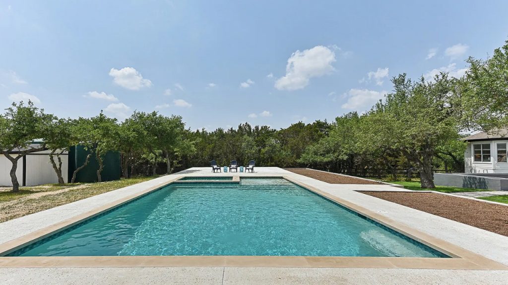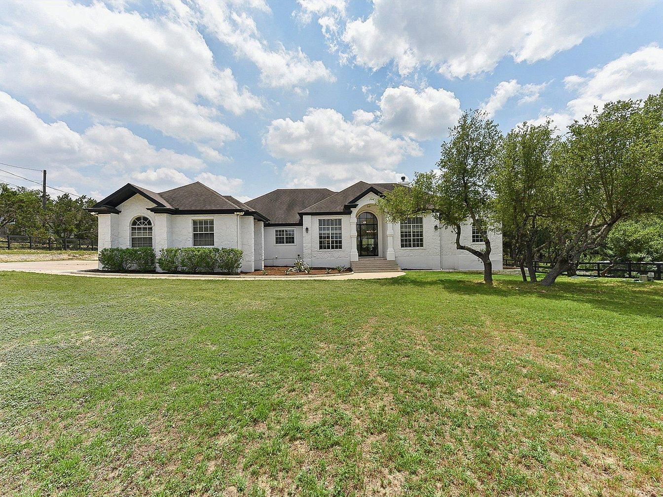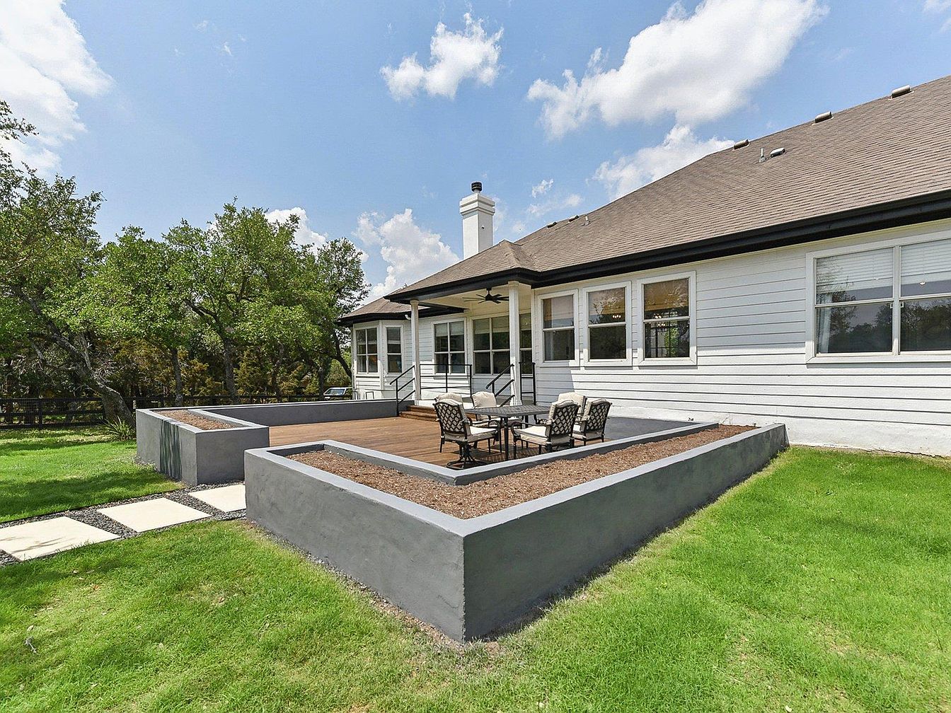 This elegant home in the Hill Country region, located in Dripping Springs, TX, showcases a blend of modern sophistication and comfortable living. Though the exact year built is not stated, the residence has been beautifully updated to offer a fresh, contemporary style. Architectural features include a striking arched glass entry, clean lines, and high ceilings that allow light to flood the interior spaces. The chef’s kitchen is a highlight, featuring navy shaker cabinets, brass hardware, quartz countertops, double Wolf ovens, and a built-in paneled fridge complemented by a large center island and cozy window seat. The spacious primary suite serves as a serene retreat with a tray ceiling painted in a bold contrast, a sitting area, and a spa-inspired bathroom equipped with a freestanding tub, dual vanities, walk-in shower, and black matte fixtures. Additional bedrooms are generously sized, providing flexible use for guests, office, or playroom. For outdoor enjoyment, the property boasts a modern in-ground pool, a private fire pit area, and a backyard dotted with mature oak trees, offering tranquility and plenty of room to roam. Conveniently close to downtown Dripping Springs, DSISD schools, and local wineries, this home sits on a peaceful acreage homesite. The listing price for this beautifully updated Hill Country home is $1,199,999.