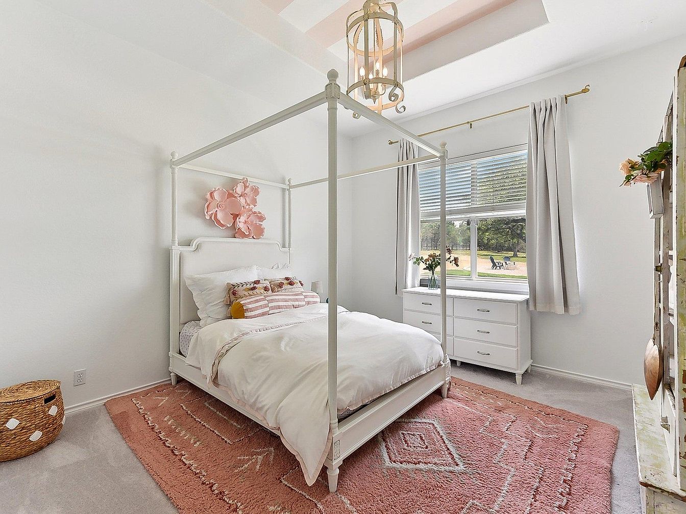 This serene bedroom features a white canopy bed as the central focal point, adorned with soft linens and subtle throw pillows in muted tones. The walls and ceiling are painted bright white, emphasizing natural light from a large window framed with simple, light-gray curtains. Beneath the bed is a warm, textured area rug in dusty rose with geometric patterns, adding color and comfort. A white dresser sits below the window, decorated with a floral arrangement to bring freshness. A woven basket in the corner lends a natural touch, while a lantern chandelier overhead adds elegant charm to the airy, minimalist space.