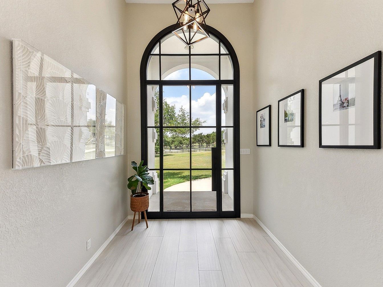 This entryway welcomes visitors with a tall, arched black-framed glass door, allowing abundant natural light to pour in while offering a clear view of the green outdoor landscape. The space features light-colored wood flooring that complements the neutral beige walls, creating a bright and airy atmosphere. On the left wall, textured white panels add subtle depth and visual interest, while three minimalist framed photographs line the right wall, contributing to a balanced and clean aesthetic. A potted plant on a mid-century modern wooden stand adds a touch of greenery and warmth, harmonizing with the overall modern yet inviting design. A geometric pendant light fixture hangs centered above, providing both style and illumination.