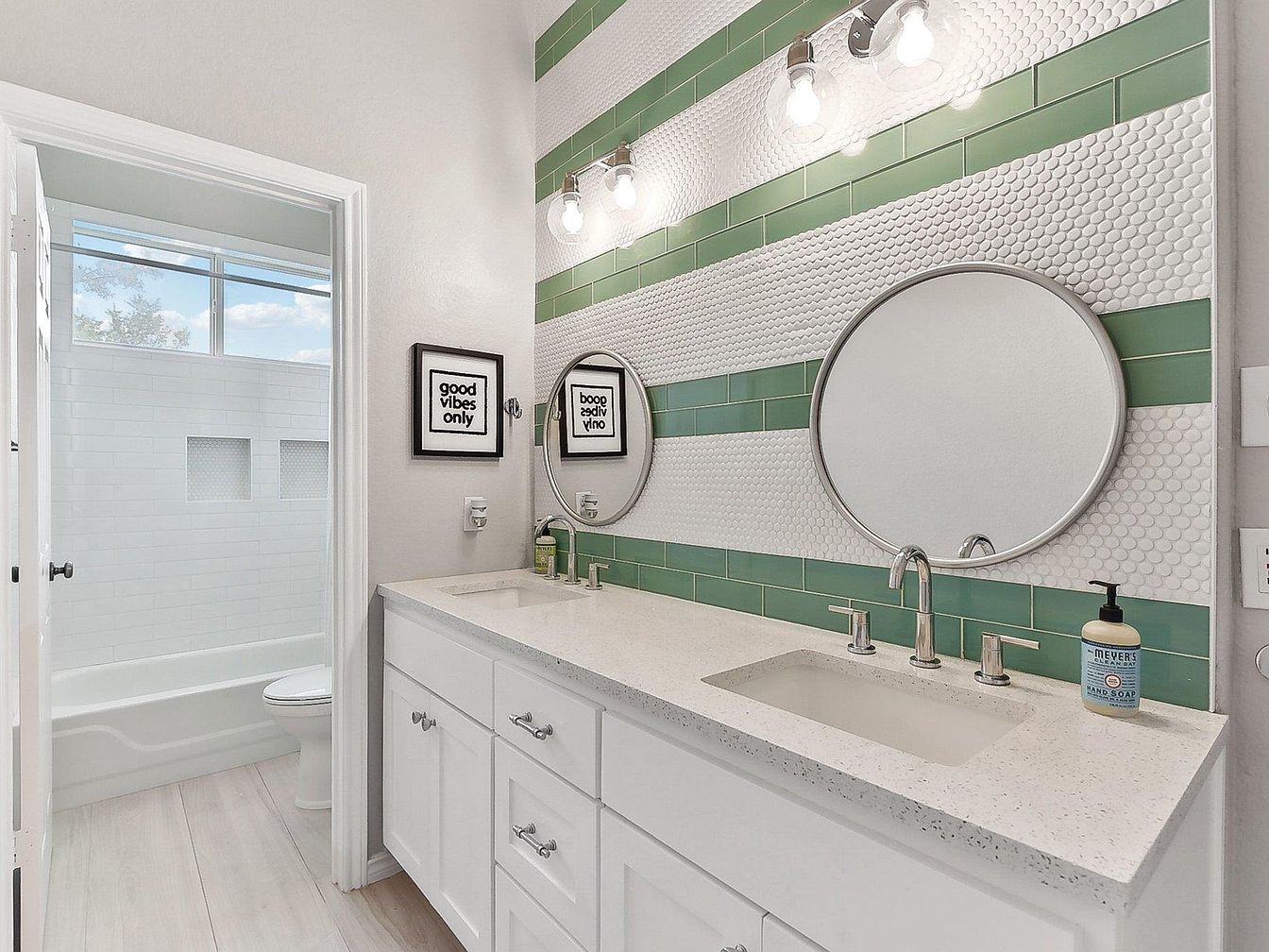 This bathroom features a double vanity with white shaker-style cabinetry topped by a speckled white quartz countertop. Two rectangular under-mount sinks with sleek chrome faucets provide functionality, complemented by two large round mirrors above each sink. The backsplash alternates between horizontal green subway tiles and textured white penny tiles, adding visual interest and a refreshing pop of color. Above the mirrors, three bulb light fixtures with clear glass shades illuminate the vanity zone. The adjacent shower area, visible through an open door, includes a white subway tile surround, a built-in niche, and natural light streaming through a wide window, enhancing the airy and clean aesthetic.