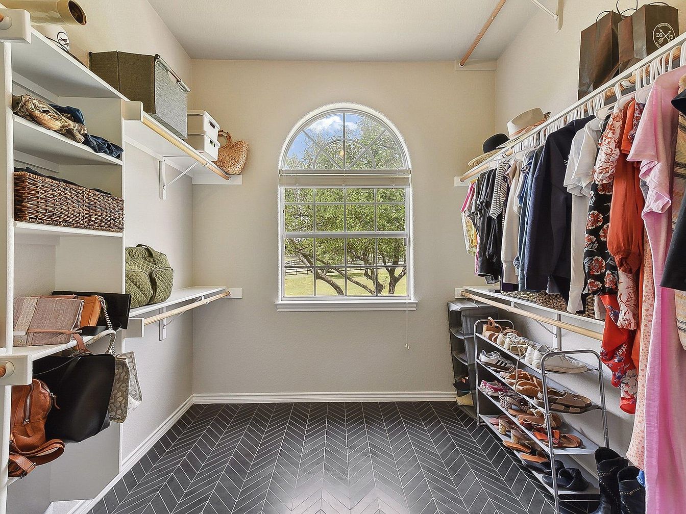 This walk-in closet is thoughtfully designed with a spacious layout, featuring a striking arched window that allows abundant natural light to illuminate the space. The walls are painted in a soft, neutral tone that complements the dark herringbone-patterned tile floor, creating a modern yet welcoming contrast. On one side, open shelving and hanging rods provide ample storage for handbags and folded items, while opposite shelves and rods extend the storage for hanging clothes in a neat, organized manner. A shoe rack neatly displays footwear, and decorative baskets add a cozy, organized touch. The overall aesthetic balances function with subtle elegance.