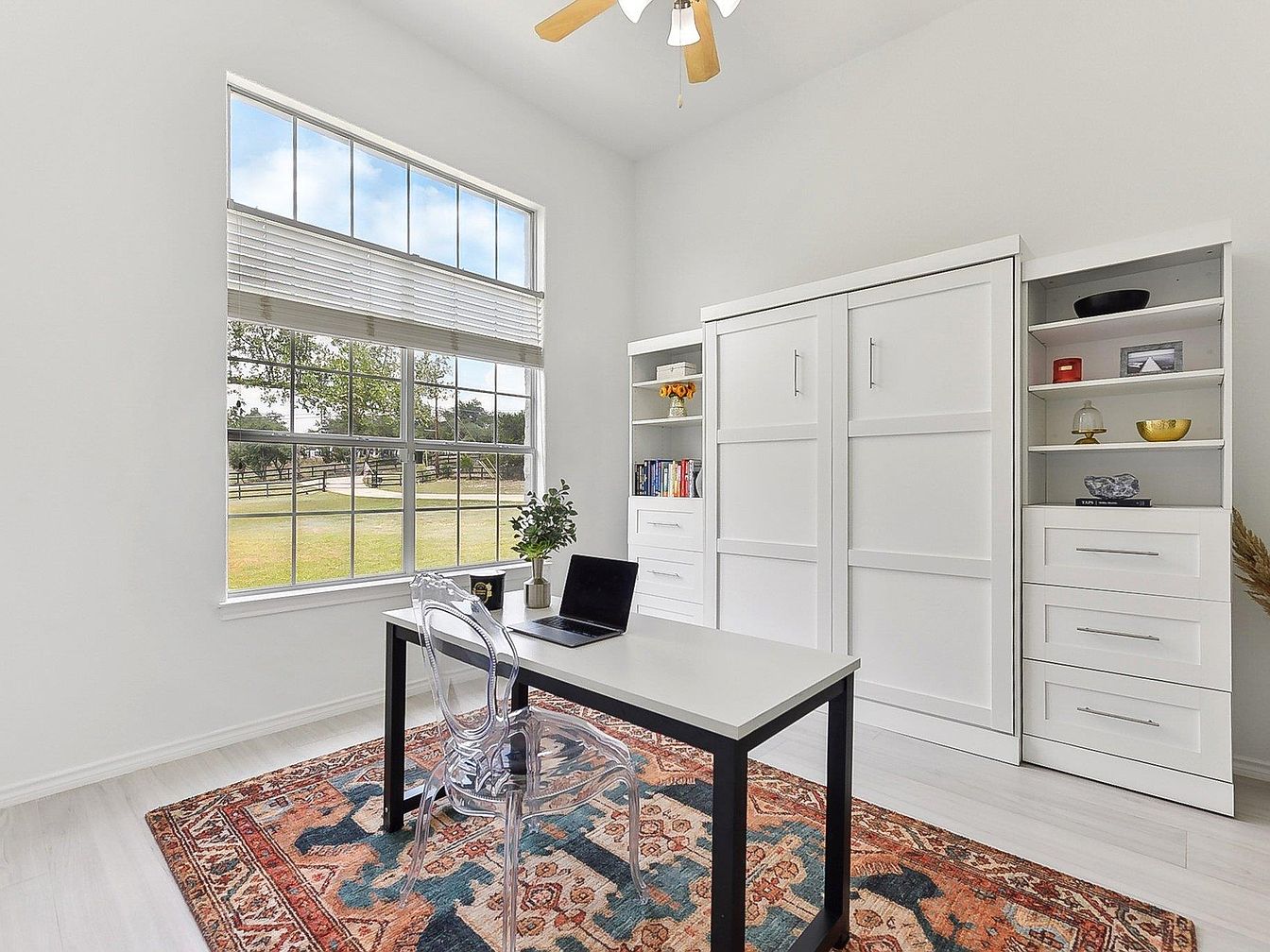 This bright home office features a minimalist design with a crisp white color palette and clean lines. A large window dominates one wall, flooding the space with natural light and offering a scenic view of a lush green yard and trees beyond. The focal point is a sleek desk with a simple white top and black legs, paired with a modern translucent chair that adds an airy feel. Against the opposite wall, built-in white cabinetry with sliding doors and open shelving offers practical storage and display space. A patterned area rug in warm earth tones anchors the room, bringing texture and color to this serene workspace. Light wood flooring and a ceiling fan with wooden blades complete the fresh, functional environment.