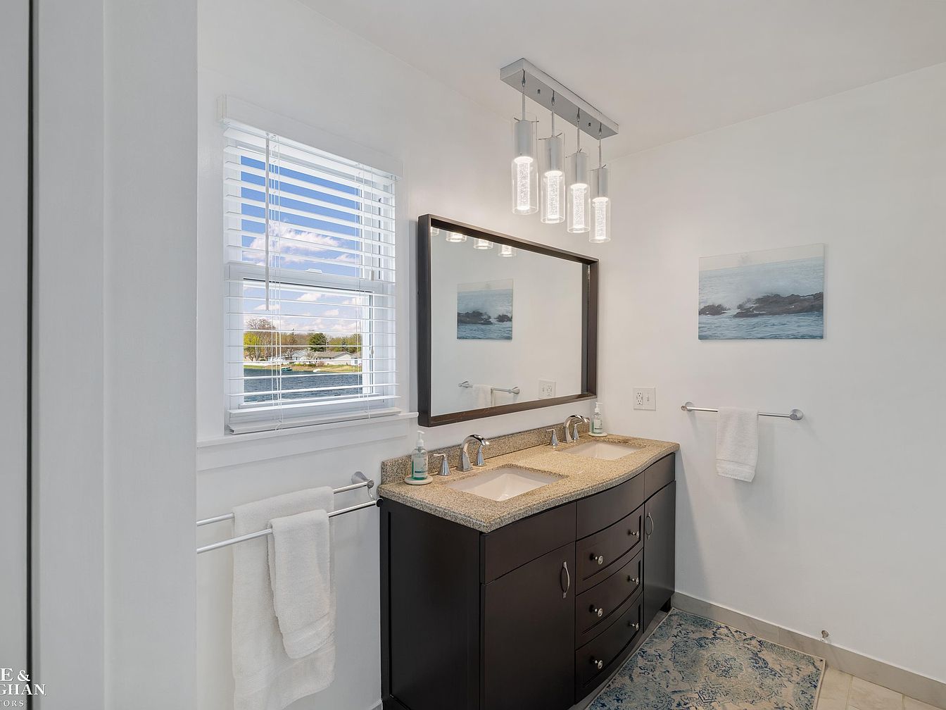 This bathroom section features a sleek double vanity with a dark wood cabinet and a speckled beige granite countertop, adding both functionality and elegance. Two rectangular undermount sinks are accentuated by modern chrome faucets. A large rectangular mirror framed in dark wood balances the vanity, while the contemporary pendant light fixture with four cylindrical glass lights creates a warm, inviting atmosphere. White walls and trim keep the space bright and clean, complemented by a soft blue and beige patterned rug on the tile floor. A window with white blinds offers natural light and a view outside, paired with chrome towel bars holding crisp white towels. Minimalist coastal artwork adds a subtle decorative touch.