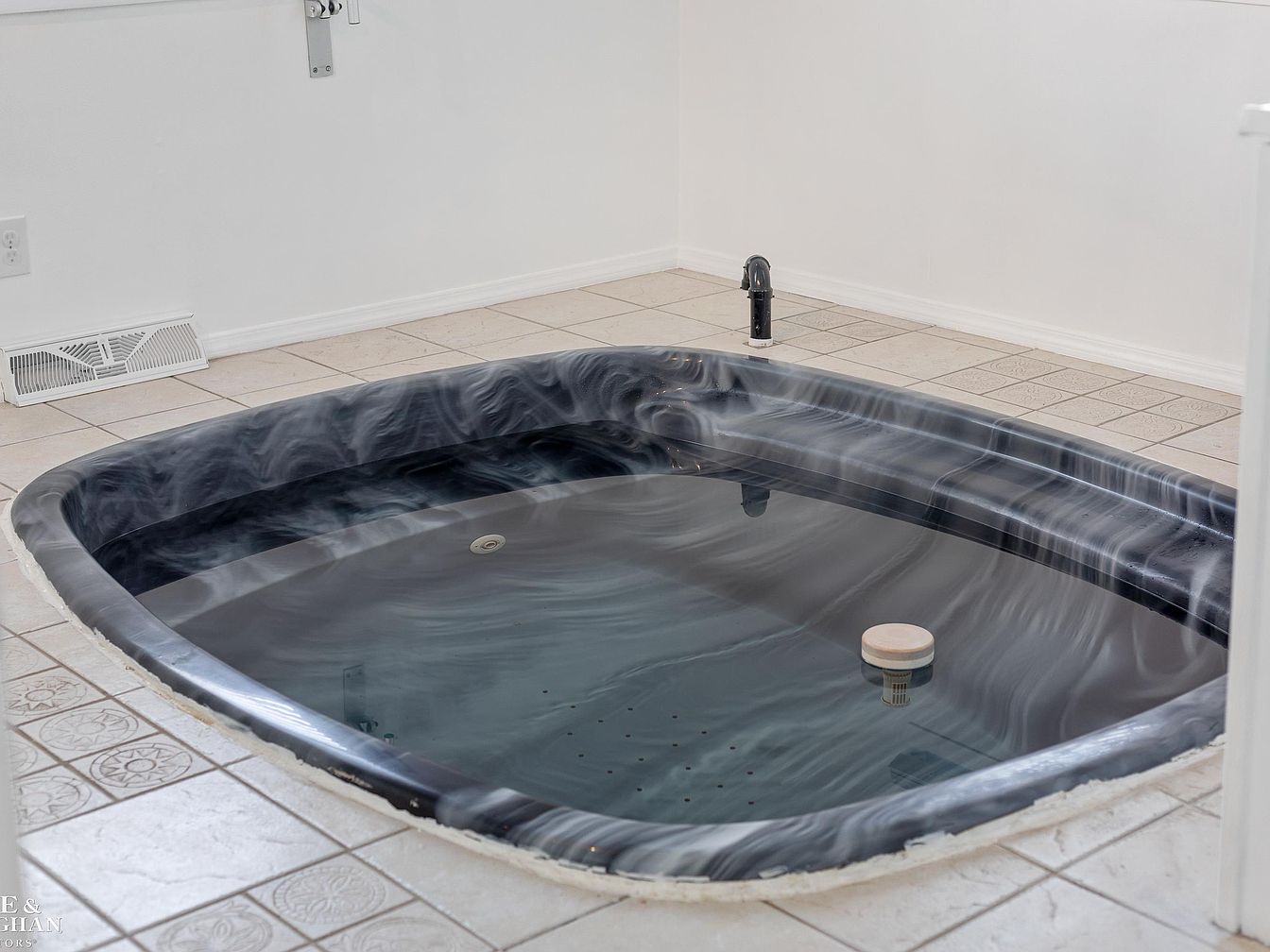 This room features a built-in indoor jacuzzi tub set deeply into a tiled floor, emphasizing relaxation and comfort. The tub has a unique dark marbled finish that contrasts with the light beige ceramic tiles surrounding it. The tiles incorporate a slight pattern, lending subtle texture to the floor without overpowering the space. Walls are kept stark white, creating a clean, minimalistic environment that enhances the sense of tranquility. A simple black faucet protrudes from the floor next to the tub, reinforcing the contemporary and understated aesthetic of the area.