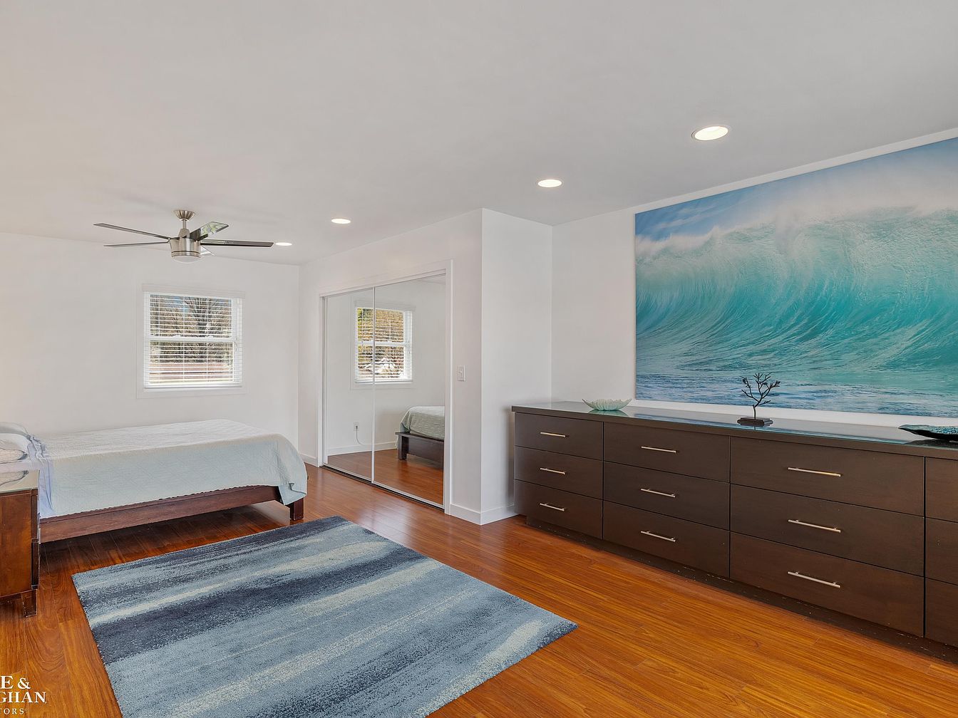 This bedroom features a clean, modern design with white walls and a smooth ceiling accented by recessed lighting and a sleek ceiling fan. The floor is a warm, natural wood tone, complemented by a large area rug in varied blue hues that echoes the colors of the striking wave artwork above a wide, dark wood dresser with metallic handles. A bed with a similarly dark wood frame sits neatly by a window with white blinds, while a mirrored sliding closet door adds depth and reflects natural light, creating an open and airy atmosphere.