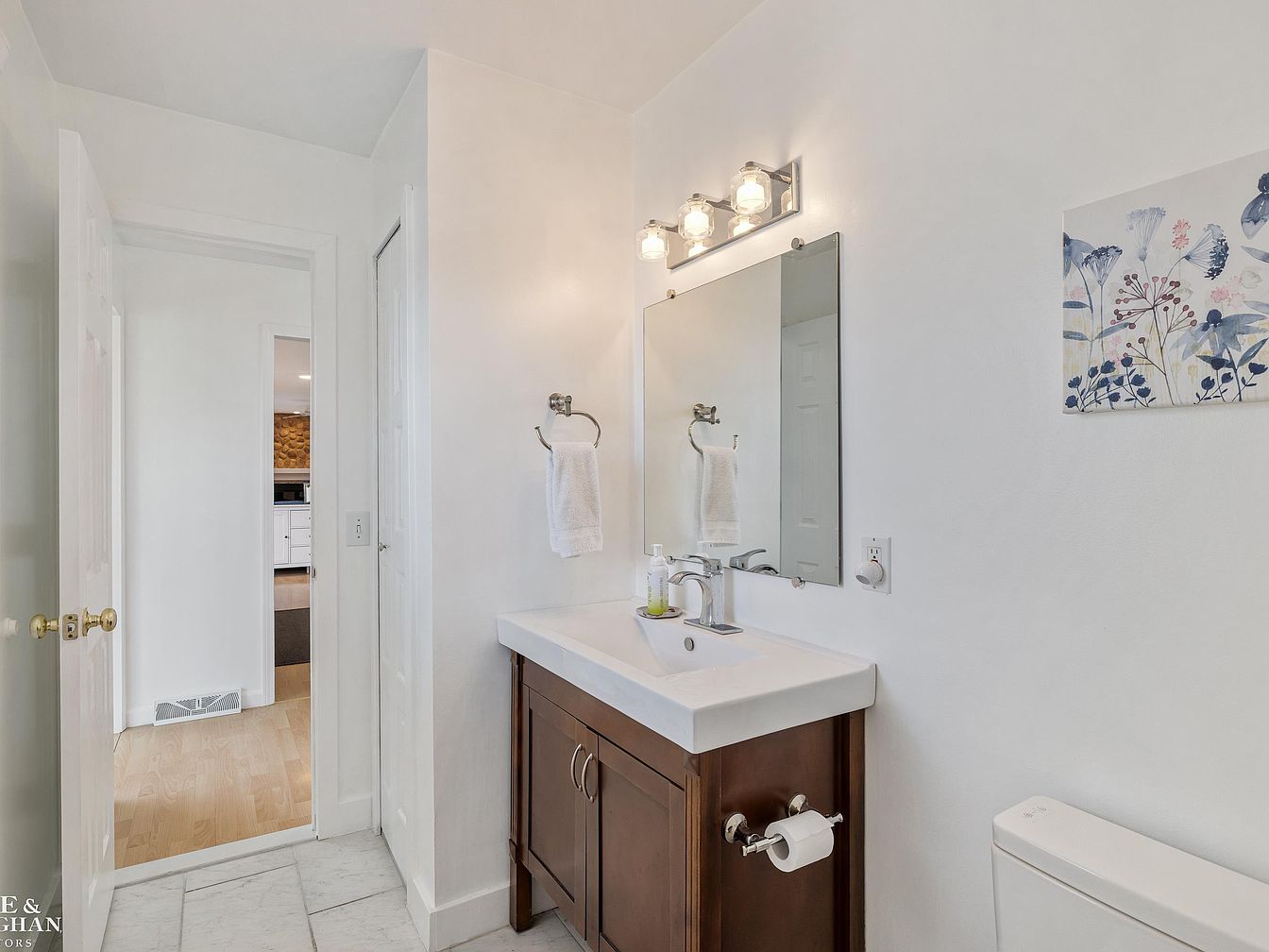 This compact bathroom space highlights a simple, clean design with a modern vanity featuring a white rectangular sink atop a dark wood cabinet with silver handles. A chrome faucet and matching towel rings add a sleek touch. The area is illuminated by a three-bulb vanity light fixture above a large wall mirror, enhancing brightness and openness. White walls coordinate with the marble-patterned tile floor, creating a fresh atmosphere. On the right, a white toilet is partially visible, and a subtle floral wall art introduces soft, muted colors while maintaining the room’s tranquil feel.