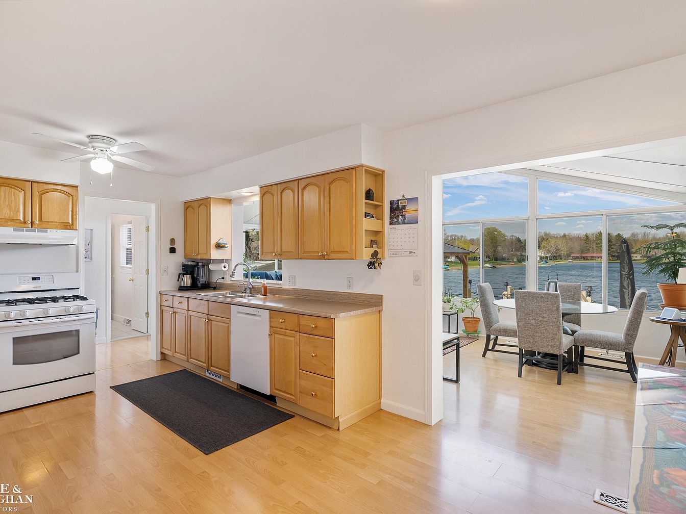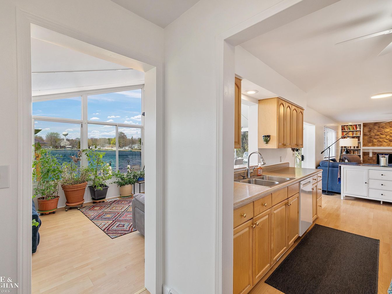 This bright kitchen features honey-toned wooden cabinets and a beige countertop with an integrated double sink and dishwasher. The space is open and inviting, with light wood flooring that extends into the adjacent sunroom and living area. A dark runner rug adds contrast on the kitchen floor. The kitchen opens directly into a cozy living room with a stone fireplace, built-in bookshelves, and comfortable blue-toned furniture. Through a wide doorway, the sunroom displays large floor-to-ceiling windows, flooding the space with natural light and offering a stunning water view. Vibrant potted plants and a colorful geometric rug enhance the inviting atmosphere of this multi-functional home area.