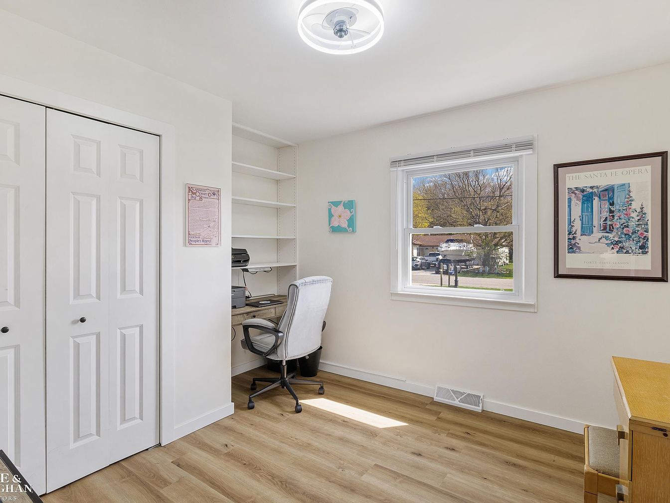 This compact home office area features a clean, minimalist design with soft white walls and natural light streaming through a single window, creating an inviting workspace. The flooring is a warm wood tone that adds a cozy contrast. The corner desk is built-in with open shelves above that hold electronics and storage, perfectly utilizing the small space beside a double-door closet. A cushioned white swivel chair offers comfort, while subtle wall art contributes a personal touch. Overall, the space blends functionality and simplicity, making it ideal for productivity within a quiet, airy environment.