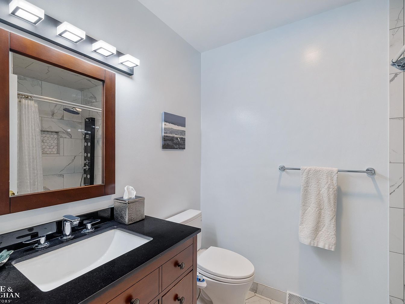This bathroom features a sleek black countertop with an under-mount white sink integrated into a wooden vanity cabinet with a rich, warm finish. Above the vanity, a large mirror framed in matching wood complements the modern four-light fixture providing ample illumination. The walls are painted a soft, neutral white, enhancing light reflection and a sense of cleanliness. Adjacent to the vanity is a white toilet set against a smooth wall with a chrome towel bar holding a textured cream towel. The space visually connects to a tiled shower area with marble-like accents, reinforcing a contemporary and functional design.