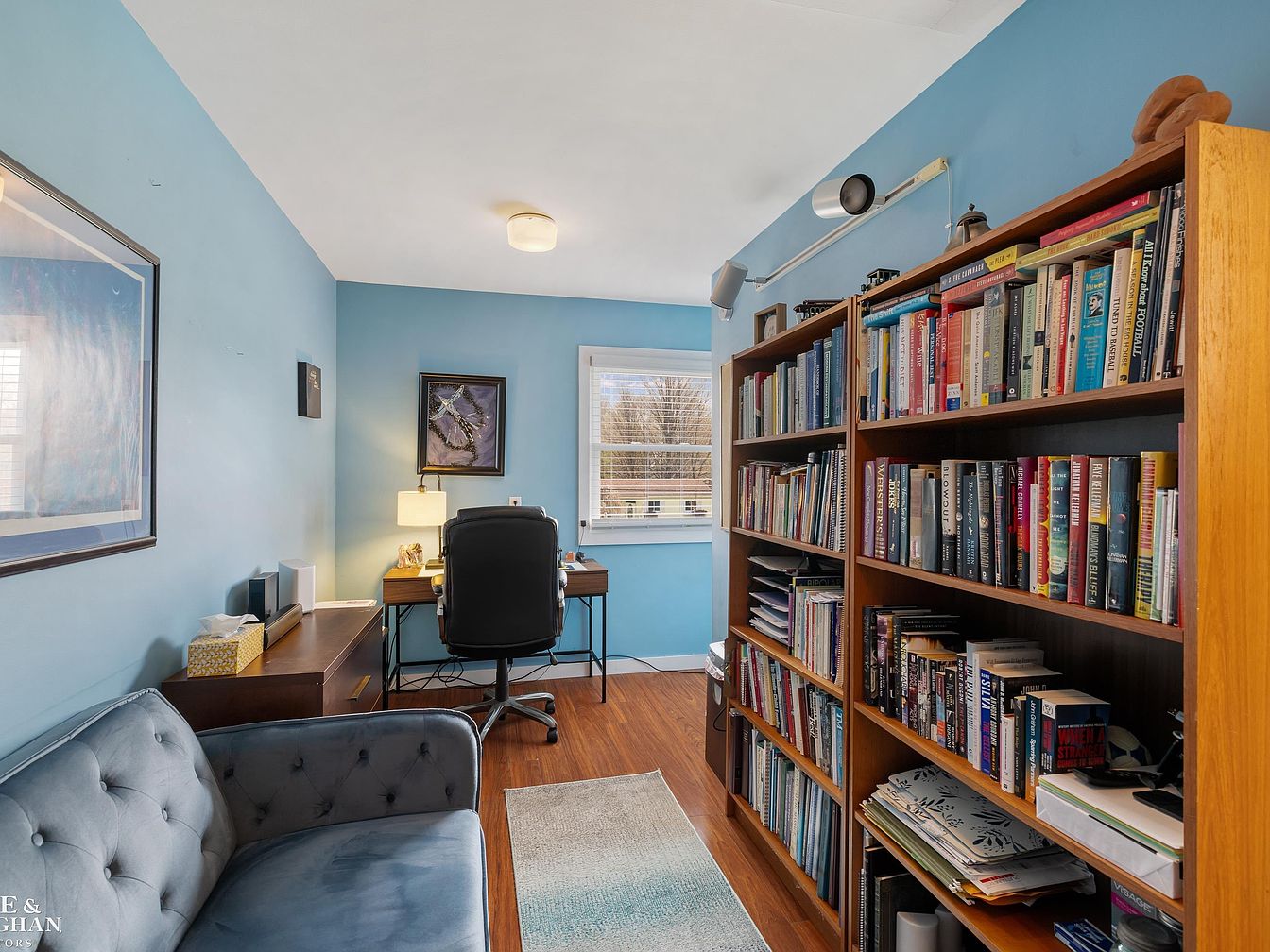 This cozy home office compliments productivity with calm sky-blue painted walls and warm wood flooring. A large, dark wooden bookshelf packed with books stands to the right, offering ample storage and intellectual charm. At the far end, a sleek desk faces a window with white blinds, inviting natural light to brighten the workspace. The desk is paired with a black ergonomic swivel chair for comfort. On the left, a tufted, blue upholstered loveseat rests near a wooden cabinet, creating a relaxed nook. Soft lighting from a lamp and ceiling fixture balances the room’s tranquil and functional aesthetic.