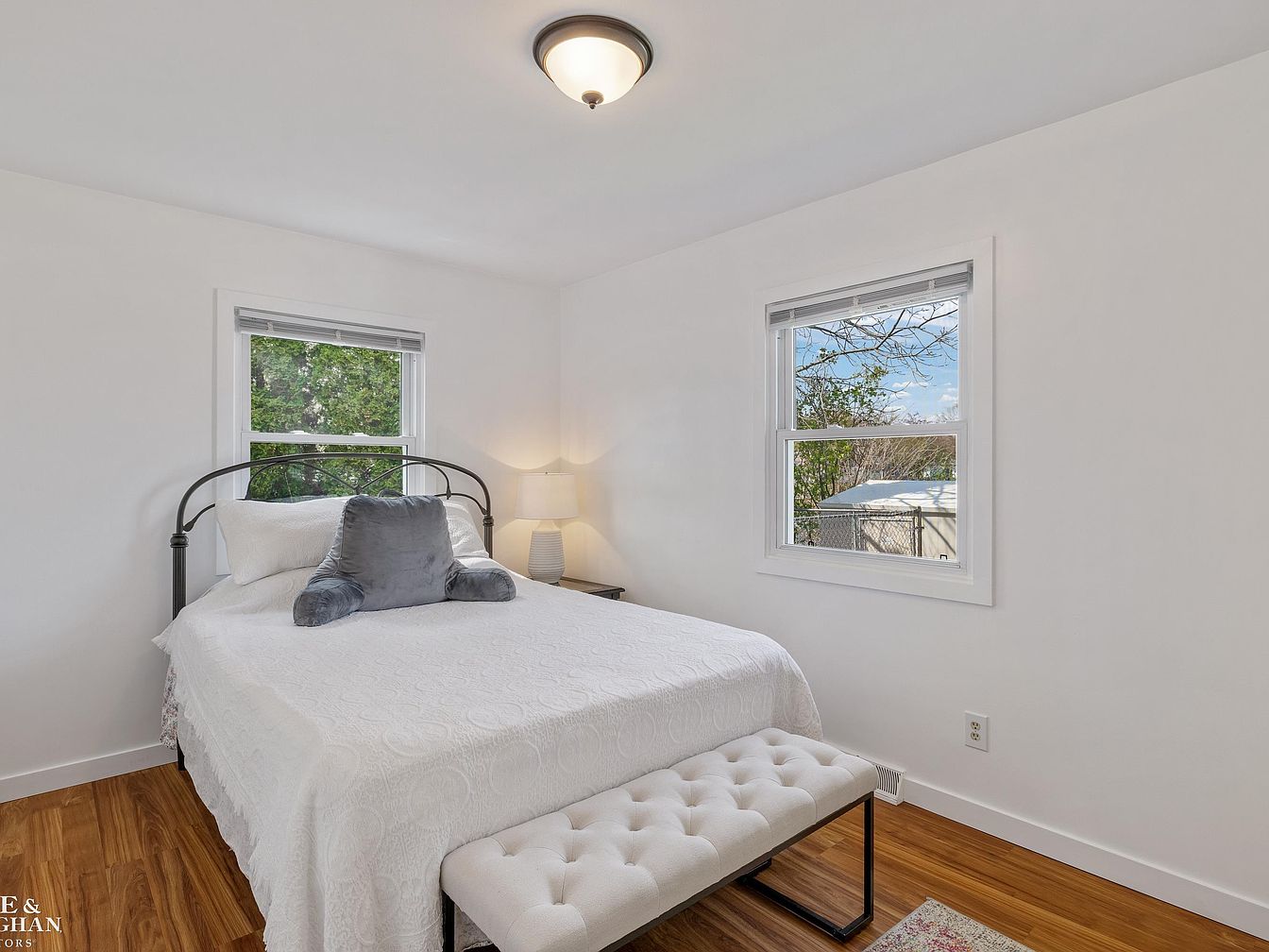 This bedroom features a serene and minimalist design with white walls that amplify natural light from two large windows. The hardwood floor adds warmth with its rich, natural tones. The bed, centered against one wall, has a simple black metal frame and is dressed in a textured white quilt, complemented by a large, plush gray pillow. At the foot of the bed, a tufted white bench with black legs offers both function and style. A small dark wood nightstand holds a contemporary, ribbed white lamp, creating a cozy yet uncluttered space perfect for rest and relaxation.