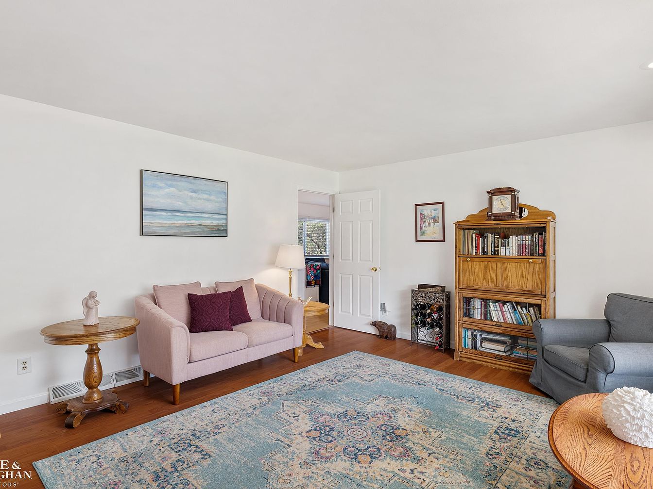 This inviting sitting room features soft white walls that brighten the space and complement the warm hardwood flooring. A pale pink loveseat adorned with deep burgundy cushions sits against one wall, paired with a classic wooden side table and a brass floor lamp providing gentle lighting. The opposite corner hosts a comfortable gray armchair, creating a balanced seating area on a large, patterned area rug in shades of blue and beige. A vintage wood bookcase with glass doors displays an array of books, topped with an antique clock, while subtle artwork adds a calming coastal and village theme to the setting. The open door leads to additional living spaces, enhancing flow and connectivity.