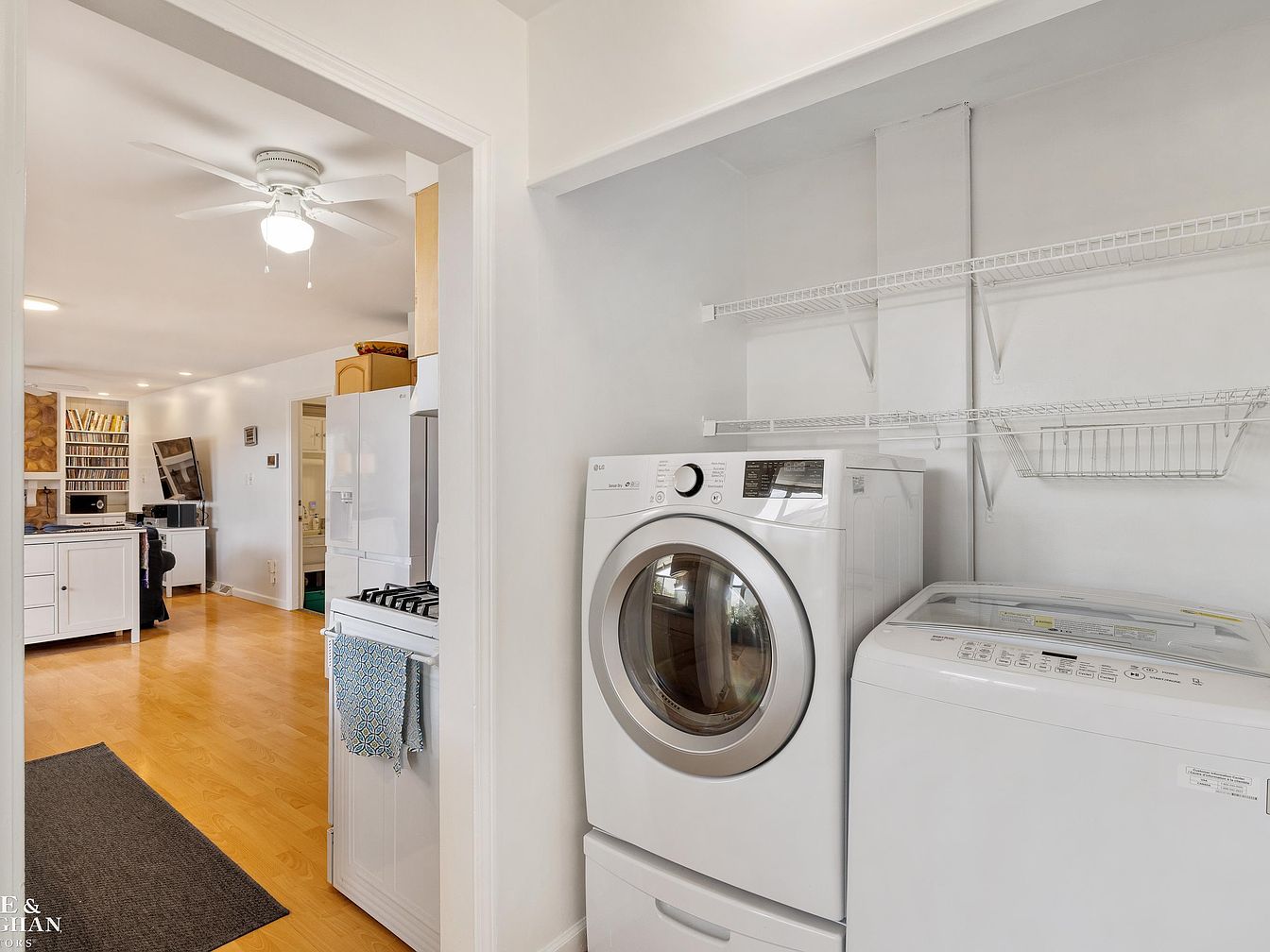 This compact laundry nook features both a front-loading washer and a top-loading dryer in white, fitting snugly into the recessed space with pristine white walls and two wire shelving units above providing functional storage. The open doorway leads directly into a warm, inviting kitchen and living area with light wood flooring and an overall clean, neutral color palette. The kitchen area displays cabinetry in light wood tones and a white refrigerator, while a ceiling fan with bright lighting illuminates the space. The overall atmosphere balances utility and openness with a bright, fresh aesthetic.