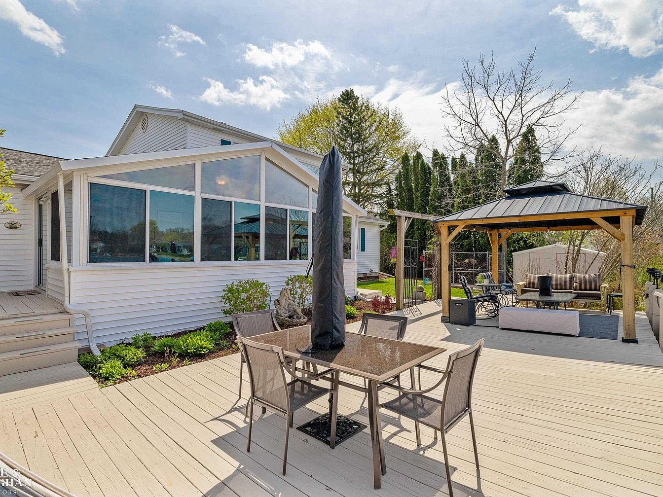 This inviting backyard patio features a spacious, light-toned wooden deck that seamlessly blends into the home’s white siding exterior. A central dining table with a covered umbrella offers a comfortable spot for outdoor meals. Adjacent, a wooden pergola with a dark metal roof shelters a seating area outfitted with cushioned couches and armchairs in neutral tones, creating a cozy haven for relaxation. Lush greenery, including trimmed bushes and tall, dense trees, borders the deck, providing privacy and a natural backdrop. The layout encourages outdoor gatherings in a casual yet stylish setting under a bright sky.