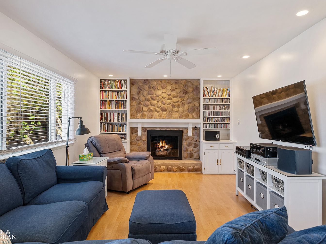 This living room exhibits a warm and inviting atmosphere anchored by a central stone fireplace with a rustic, natural texture that serves as the focal point. Flanking the fireplace are built-in white bookshelves filled with books and media, adding both character and practical storage. The seating arrangement includes a plush blue sofa with a matching ottoman, complemented by a comfortable recliner in a soft grey tone. Light hardwood floors brighten the space and contrast with the predominantly white walls and ceiling, which features recessed lighting and a white ceiling fan. A large flat-screen TV is mounted opposite the seating area on a white media console with woven baskets for additional organization, completing the blend of comfort and functionality.