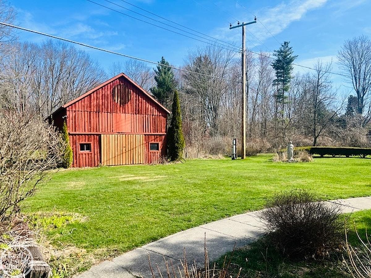 This outdoor space features a charming rustic red barn with vertical wooden planks and natural wood double doors flanked by two small windows, set against a backdrop of leafless trees and a bright blue sky. The well-maintained green lawn stretches across the yard, bordered by a concrete pathway weaving through some low bushes. A tall utility pole with overhead wires adds a touch of rural authenticity. The overall aesthetic is a blend of countryside charm and natural simplicity, providing a peaceful, open area ideal for outdoor activities or gardening.
