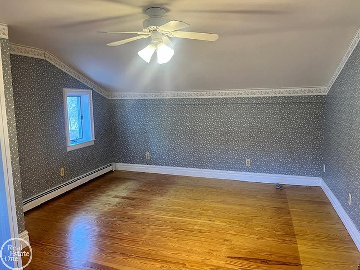 This cozy bedroom features slanted ceilings that create an intimate atmosphere, highlighted by a ceiling fan with four lights at the center. The walls are adorned with blue floral wallpaper trimmed by a delicate floral border near the ceiling, giving a vintage charm to the room. Natural light filters in through a small rectangular window on one wall. The flooring is a warm, medium-tone hardwood that adds richness and warmth. Baseboard heating lines the lower wall, and white trim around the window and baseboards offers a clean contrast to the patterned walls.