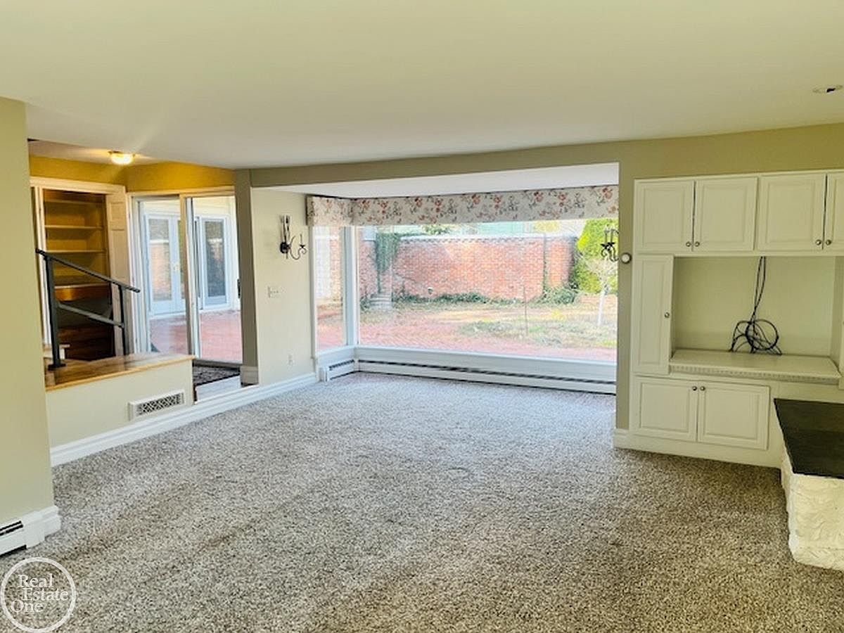 This bright, spacious living room features a large, floor-to-ceiling window that offers an unobstructed view of the garden and brick wall outside, bringing natural light into the space. The room is carpeted in a soft, neutral gray tone that complements the pale green walls, creating a calm and welcoming ambiance. On one side, white built-in cabinetry with classic paneling provides storage and display space, while a small hearth with a mantel suggests a cozy fireplace area. The layout gently leads to an adjacent stairwell and entryway with sliding glass doors, enhancing flow and connectivity.