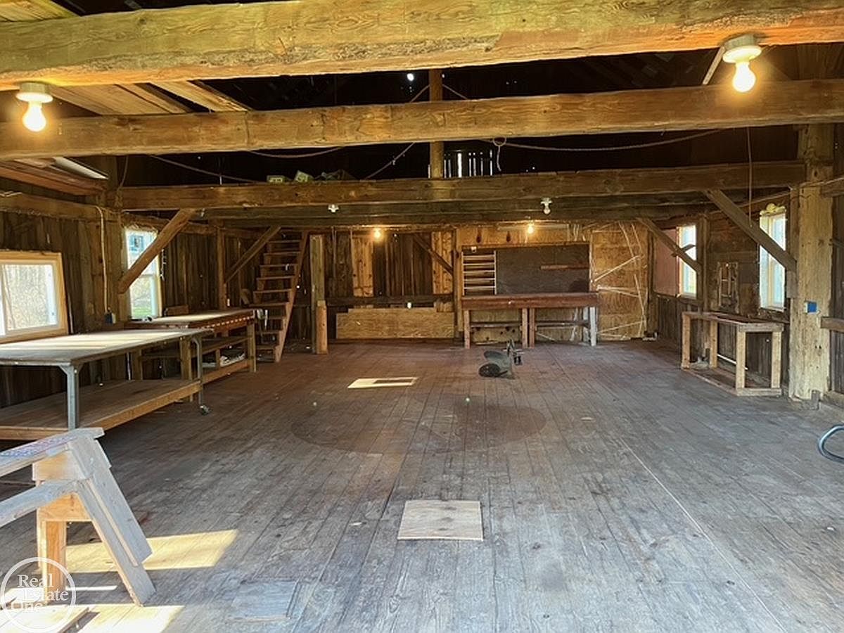 This expansive workshop area features raw, unfinished wooden floors and sturdy exposed beams that create a distinctly rustic ambiance. Several workbenches line the perimeter, providing ample space for DIY projects or crafts. The lighting is simple, with exposed bulbs casting a warm yellow glow across the room. Windows on both sides allow natural light to filter in, balancing the dark tones of the wood. A small stairway at the back hints at an upper loft or storage area. The open layout is highly versatile, ideal for practical use with a charming, old-world character.