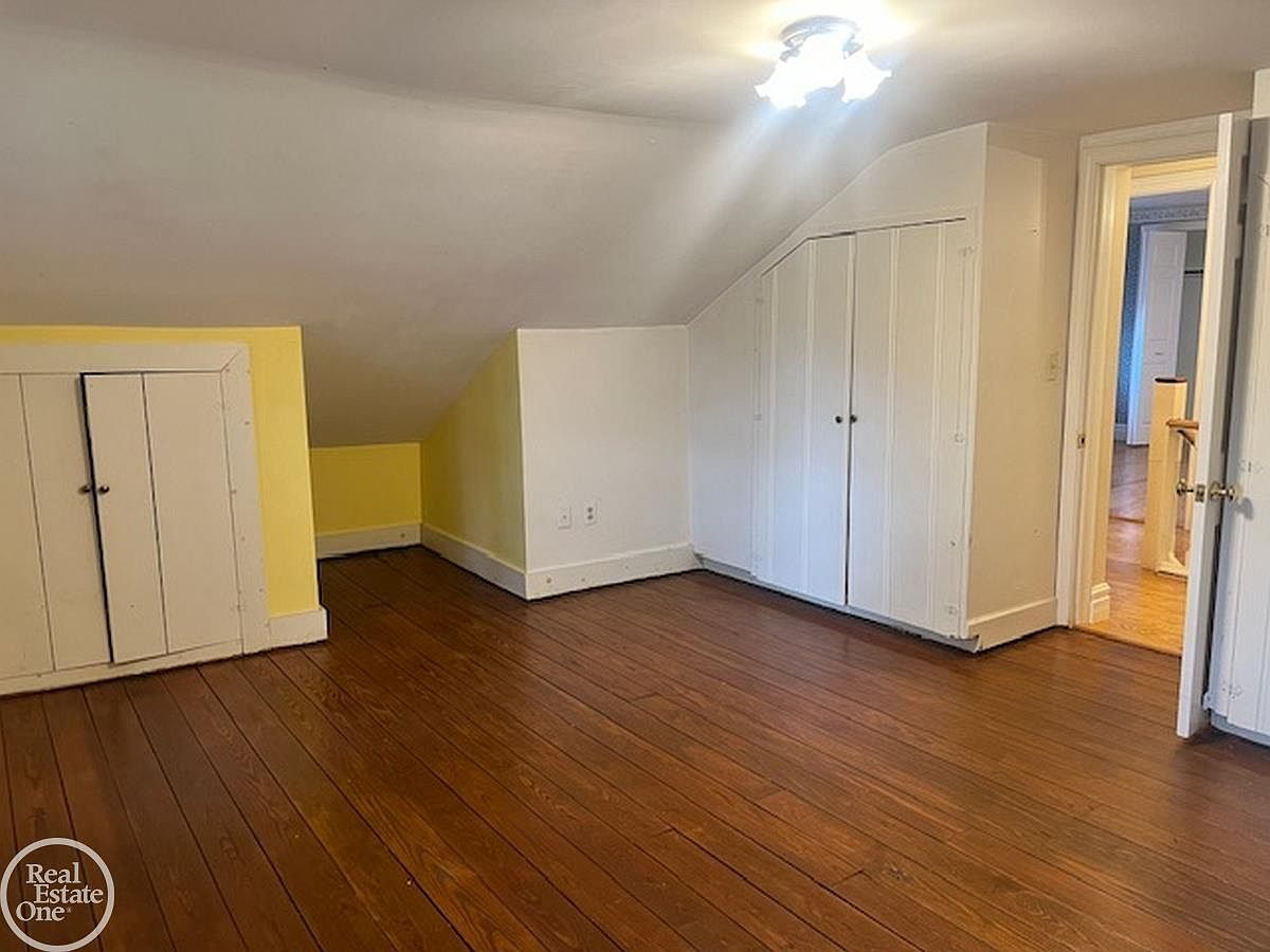 This cozy attic bedroom features warm-toned wooden plank flooring that adds a comforting, natural touch. The sloped ceiling creates an intimate atmosphere, while the walls alternate between soft white and a pale buttery yellow, injecting subtle warmth and character into the space. Built-in closets with simple white paneled doors fit snugly under the eaves, maximizing storage in this compact room. The doorway opens to a hallway with similar hardwood flooring, suggesting continuity throughout the home. A modest overhead light fixture brightens the space, enhancing the room’s inviting, lived-in feel.