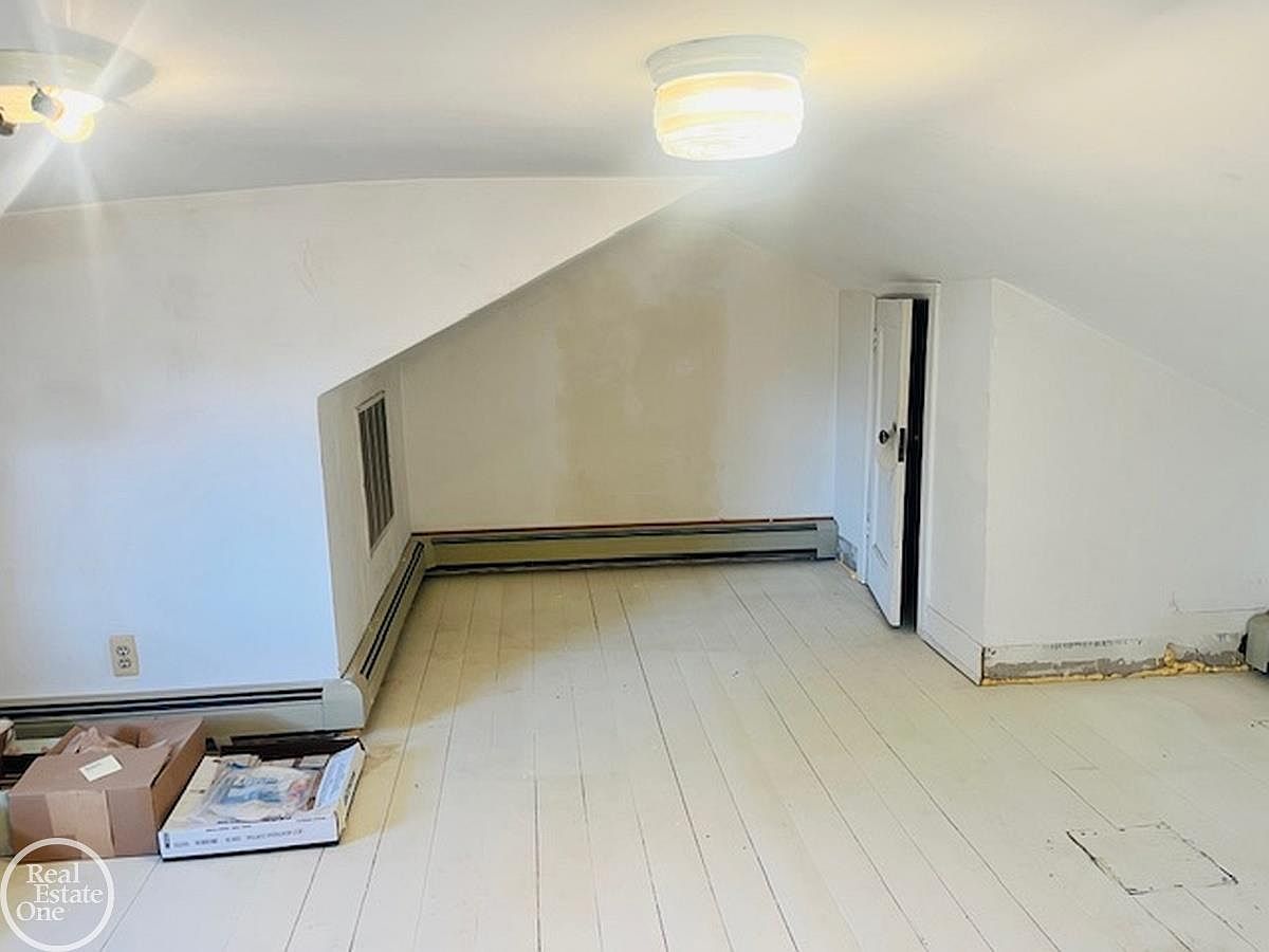 This small attic area features an angled ceiling typical of upper-story spaces beneath the roof. It has a simple, neutral color palette with white walls and floorboards, creating a light and airy feel despite the low ceiling height. Baseboard heating lines the perimeter of the room, adding a functional element without detracting from the simplicity. The floor shows some wear with a patch visible near the center. A small door is present on the right side, suggesting access to additional storage or utilities. Minimal lighting includes a flush-mounted ceiling fixture providing soft illumination.