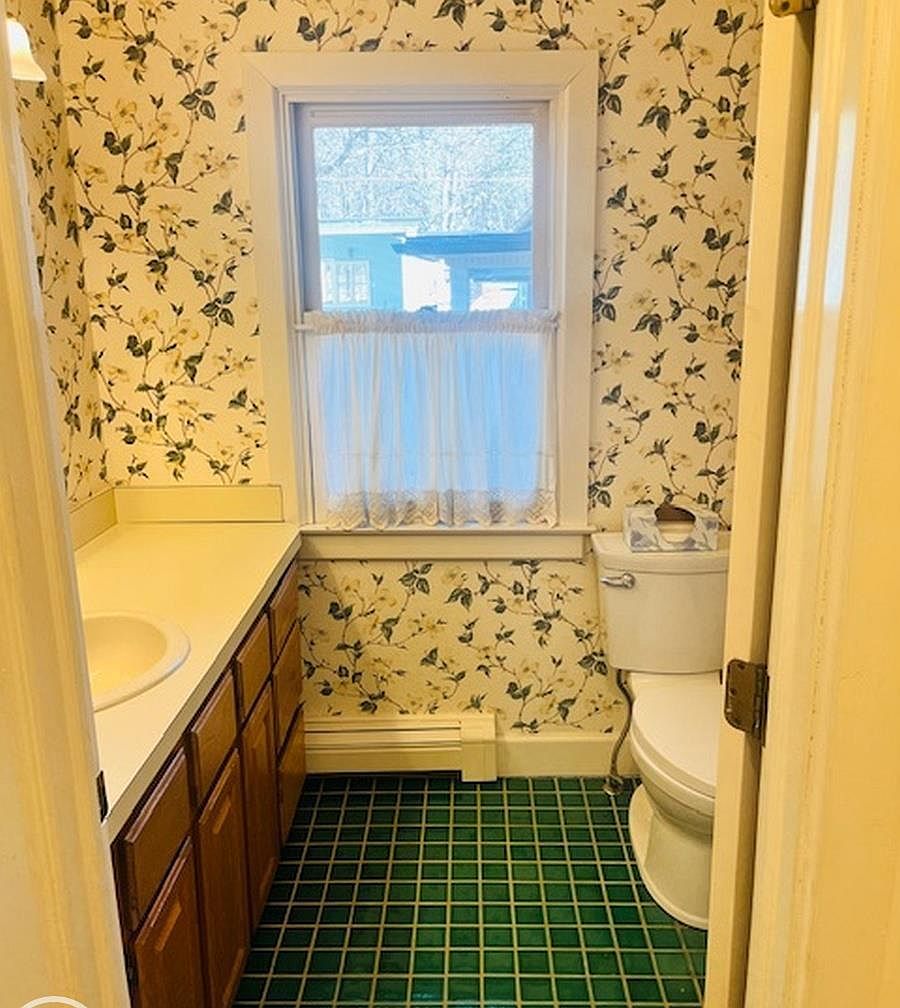 This compact bathroom features a charming vintage aesthetic with floral wallpaper covering all walls, lending a cozy, cottage-like feel. A wood-paneled vanity with a cream-colored countertop and integrated sink lines the left side, while a white toilet sits flush to the right beneath a window with soft gauzy curtains that allow natural light to gently filter in. The floor contrasts boldly with deep green square tiles set in a grid pattern, adding a grounded, earthy tone. The room’s overall design is quaint and inviting, blending classic patterns with functional simplicity.