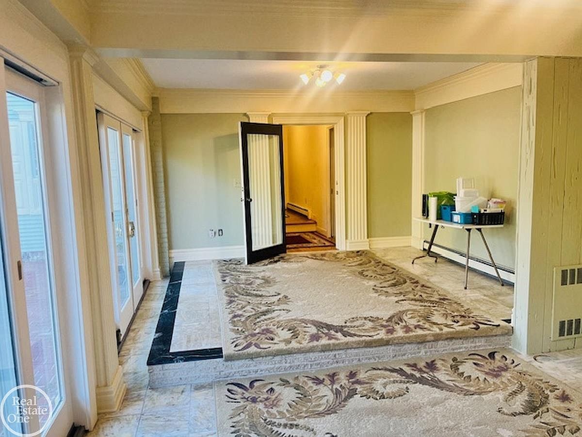 This entryway foyer features a classic, spacious design with soft sage green walls framed by cream-colored crown molding and decorative columns, adding an elegant architectural touch. The flooring consists of polished marble tiles accented with a black marble border, stepping down to a raised platform area. Two large, intricately patterned area rugs with floral motifs in muted earth tones provide warmth and texture. On the right, a simple folding table holds various supplies, suggesting the space is ready for personalization. Two sets of glass double doors on the left flood the foyer with natural light, enhancing its open and airy feel.
