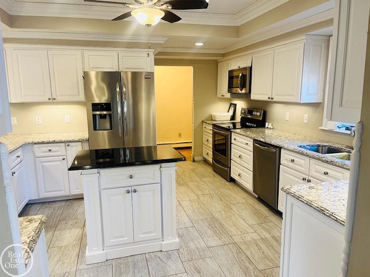 This kitchen features a bright and airy design with white cabinetry providing a clean, classic look. The space is anchored by granite countertops which extend through all surfaces, offering both style and durability. The layout is thoughtfully organized with ample cabinet storage surrounding the room, accentuated by stainless steel appliances including a side-by-side refrigerator, microwave, oven, and dishwasher. A compact central island with a glossy black countertop adds functionality for prep work. The light gray tile flooring complements the neutral beige walls, while recessed lighting and a ceiling fan with light fixtures enhance the practical ambiance of this modern cooking space.