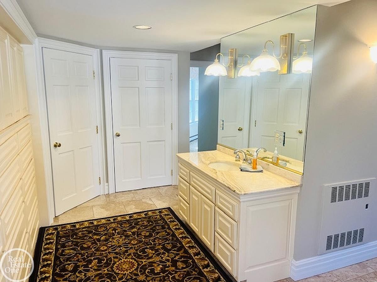 This bathroom vanity area features a spacious cream-colored cabinet topped with a marble countertop housing a single sink. A large wall-to-wall mirror above the vanity amplifies the light from elegant, vintage-style brass sconces with frosted glass shades. The space is framed by two classic white paneled doors leading to adjoining rooms or storage. Neutral tones dominate, including soft beige floor tiles and light gray walls, enhancing the room’s bright, clean ambiance. Accented by a richly patterned black and gold area rug, it adds warmth and a touch of traditional elegance to this functional space.