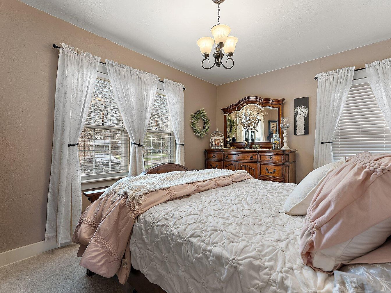 This bedroom exudes a warm and inviting ambiance, with soft beige walls complementing white trim and plush carpeting. Large windows on two adjacent walls provide ample natural light, softened by sheer white curtains tied gently in the middle. The bed, dressed in textured white bedding with coordinating blush pink accents, commands the room’s center. A classic wooden dresser with an ornate mirror adds rich, dark wood tones, enhanced by tasteful decor like a floral arrangement and candle holders. A delicate chandelier overhead completes the tranquil and comforting aesthetic of this intimate space.