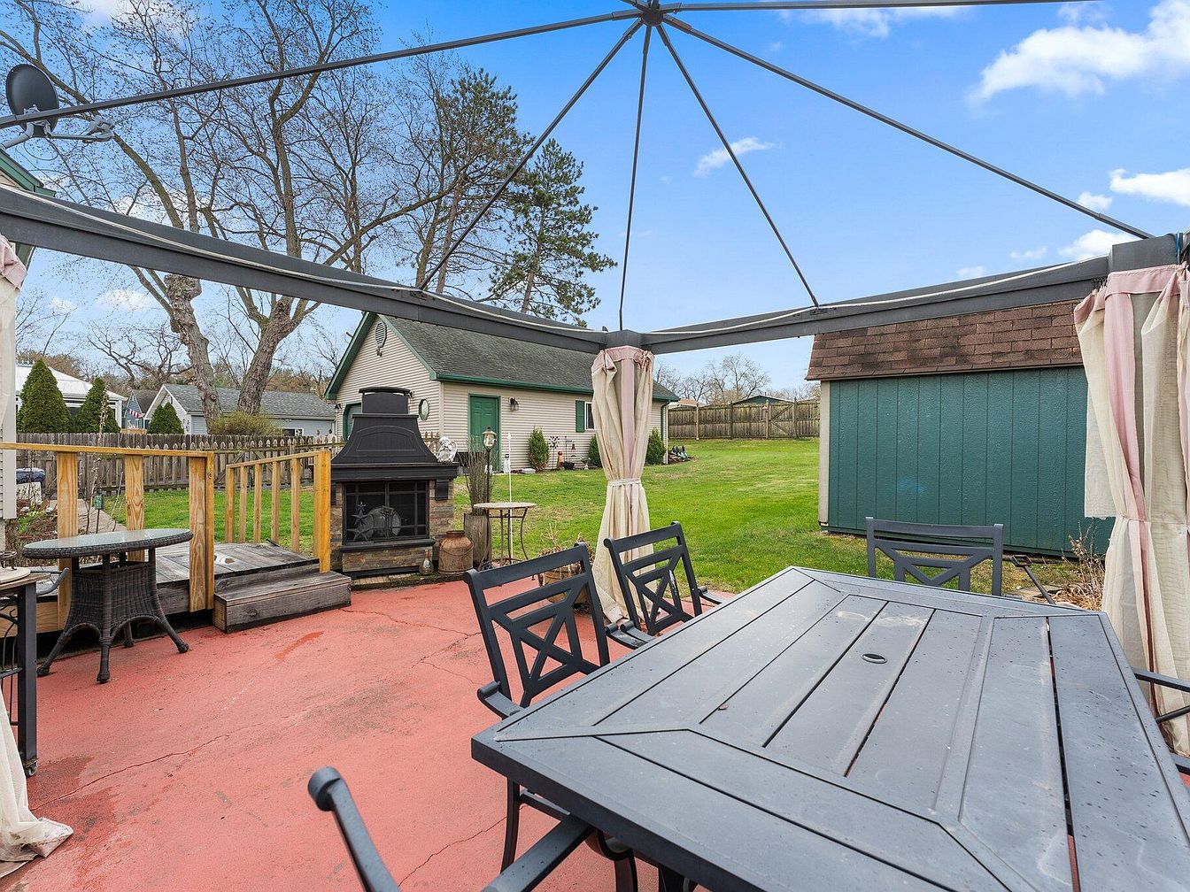 This outdoor patio area features a spacious concrete floor with a reddish hue and some natural cracks, suggesting it has been well used. A black metal dining set with a rectangular table and chairs with geometric backrest designs sits beneath a metal-frame pergola, currently without a cover but with tied-back beige curtains at the corners. In the background is a charcoal-colored outdoor fireplace made of stone and metal. The patio overlooks a large, green lawn bordered by a wooden fence, a green shed with brown shingles, and a detached garage with green trim, creating a serene suburban backyard atmosphere.