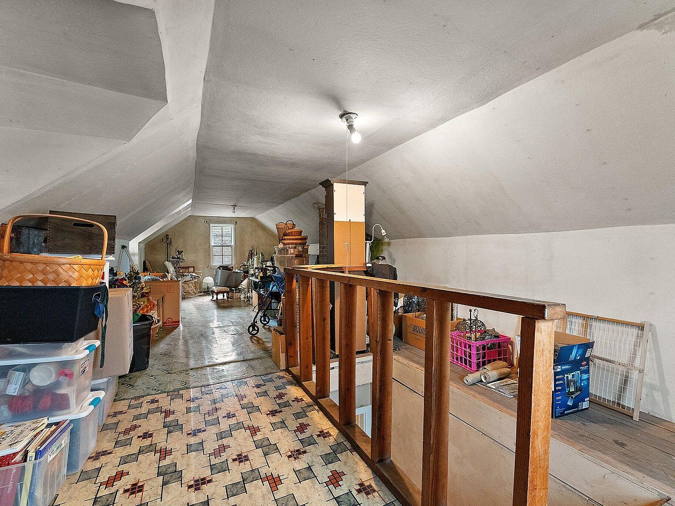 This attic space features a sloped ceiling typical of upper home levels, creating a cozy but functional area primarily used for storage. The flooring combines patterned tiles near the staircase with worn floorboards extending into the room. A simple wooden railing borders the stairwell for safety. The walls and ceiling are painted a muted off-white, with slight signs of age and wear. The area is lit by exposed light bulbs, giving it a utilitarian feel. Various household items, baskets, and boxes are neatly arranged along both sides, emphasizing its use as an organized storage room.