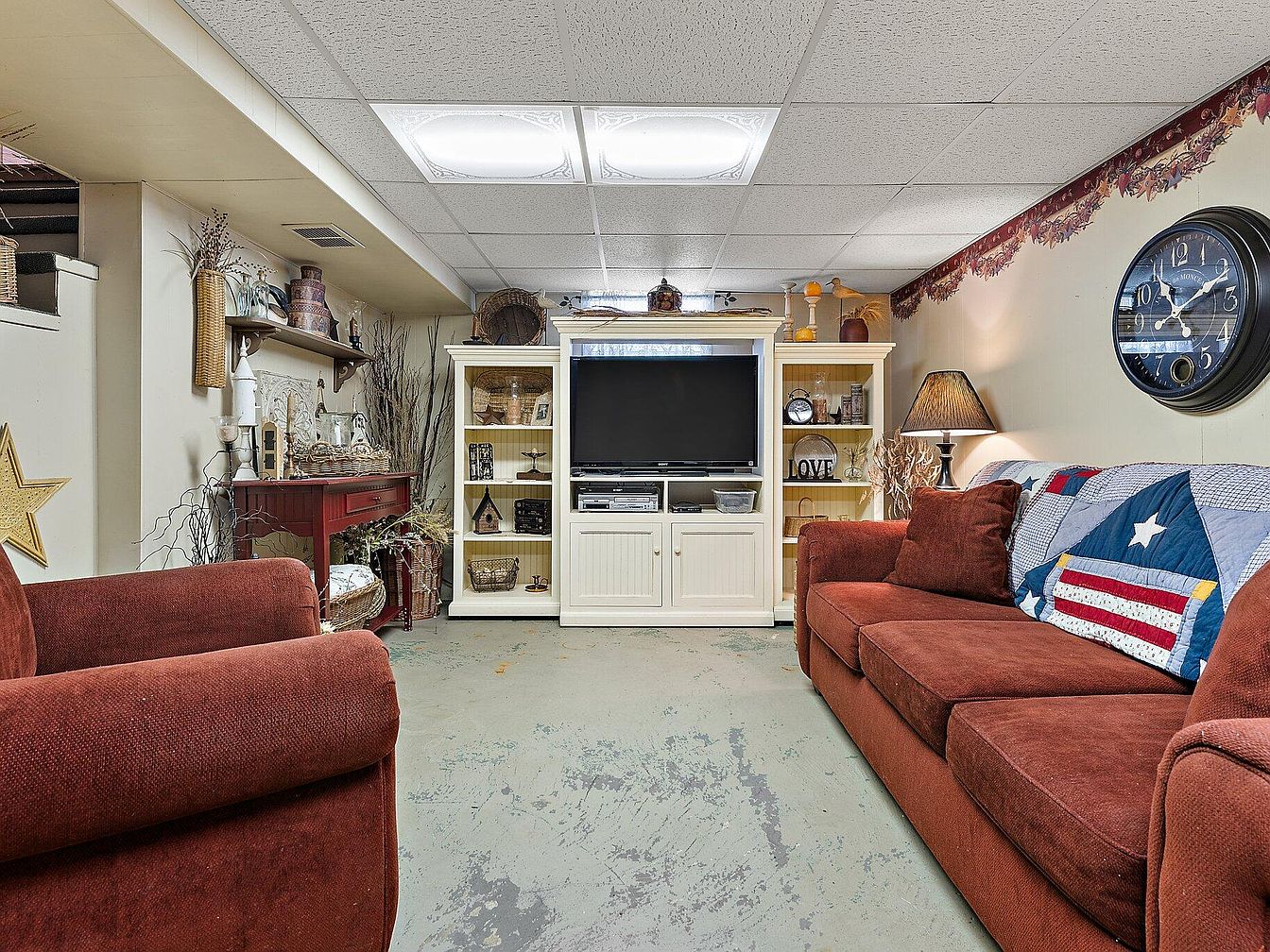 This basement lounge exudes a warm and inviting atmosphere with its earth-toned color palette dominated by deep rust-colored sofas complemented by cozy throw pillows and an Americana quilt. The worn, painted concrete floor adds rustic charm, while cream-colored built-in shelves and cabinets provide organized storage and display space for decorative items like baskets, figurines, and clocks. A vintage wall clock and table lamp next to the sofa enhance the homey feel, and floral wallpaper trim along the ceiling border brings a quaint, cottage-like touch. This space is perfect for casual relaxation or entertainment.