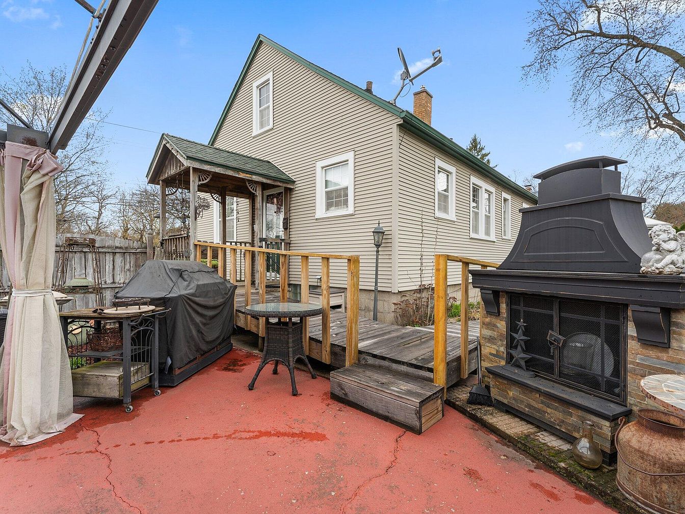 This backyard patio features a spacious red concrete floor, subtly cracked, which adds a rustic charm to the outdoor living space. A wooden ramp with simple railings leads to a back door covered by a modest gabled awning with wooden accents. Alongside the ramp, a round glass-topped table and a covered grill suggest a focus on outdoor dining and entertaining. Anchoring the area is a large black metal fireplace set against a stone base, lending a cozy ambiance. The natural wood fencing and bare trees in the background complete a relaxed, functional, and inviting outdoor retreat.