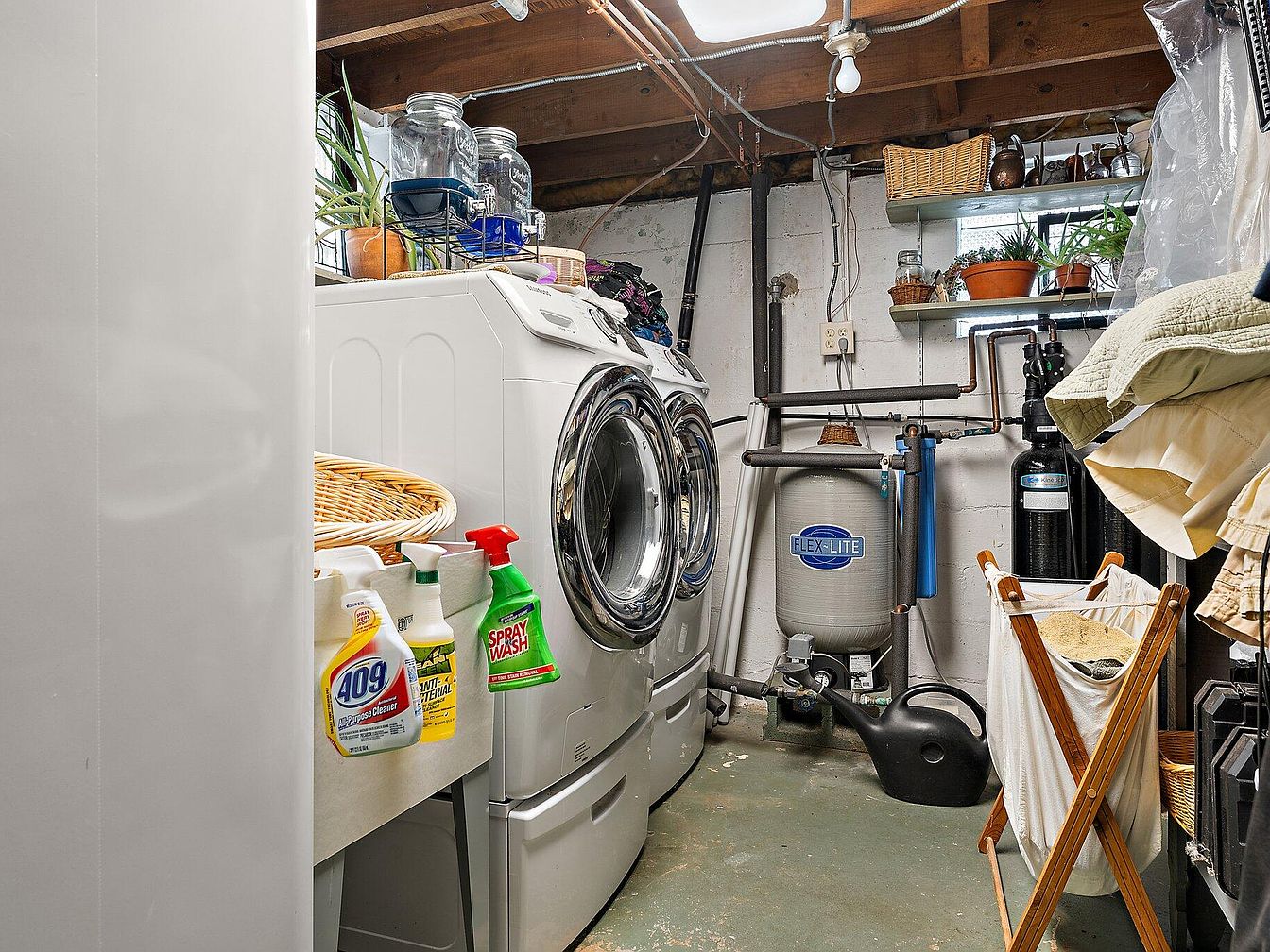This cozy basement laundry space features a practical layout optimized for utility. Two modern front-loading laundry machines sit side by side, with their sleek white finish contrasting against the rough concrete floor and exposed wooden ceiling beams. The walls are painted in a muted, industrial gray, with visible pipes and a water system tank adding to the utilitarian aesthetic. Shelves are stocked with potted plants and wicker baskets, softening the room’s industrial feel. Cleaning supplies neatly line the washer’s side, while a wooden laundry hamper and a black watering can complete the home’s functional yet welcoming vibe.